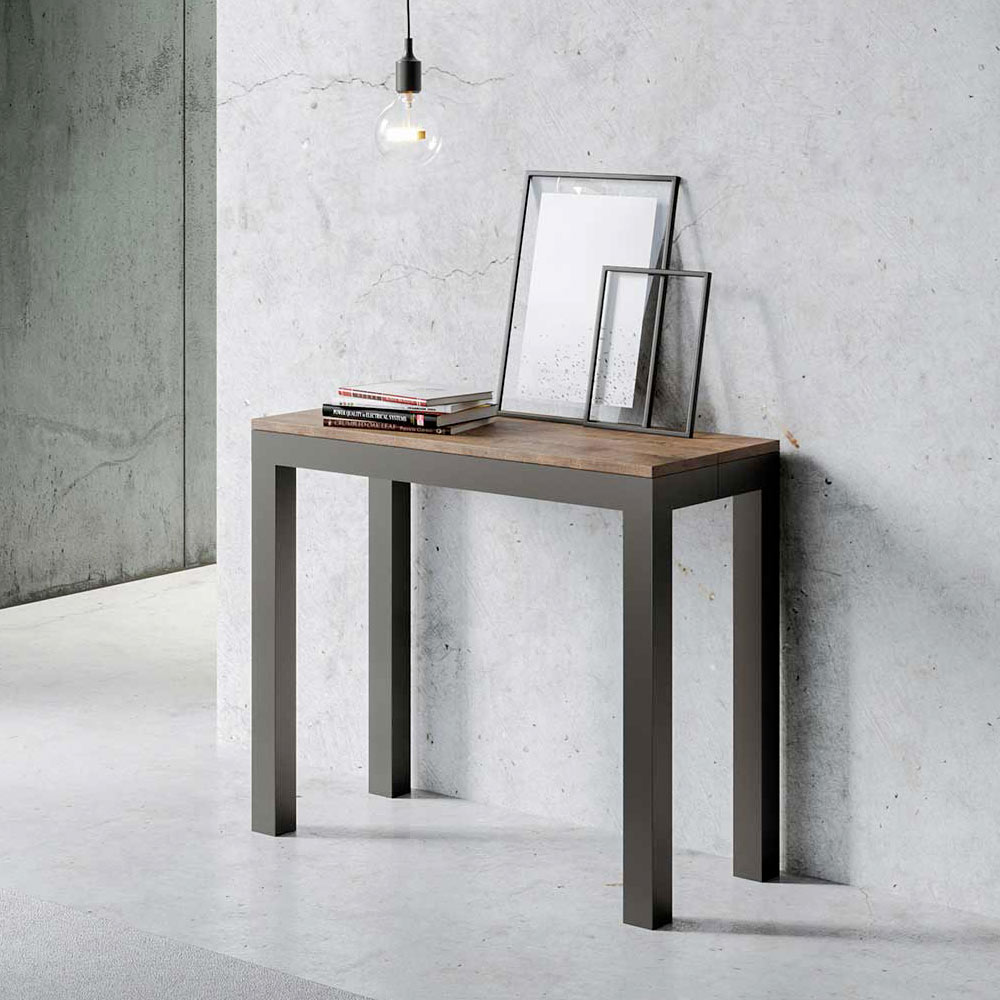 Această masă consolă extensibilă combină designul modern curat cu eficiența spațială maximă. Cadrul lat și solid realizat din fier tăiat cu laser de înaltă precizie formează structura de susținere, iar un cadru din fier susține un blat rafinat din lemn care se extinde armonios, dezvăluind posibilitatea unei duble utilizări: elegant și discret când este închis, spațios și primitor odată deschis.