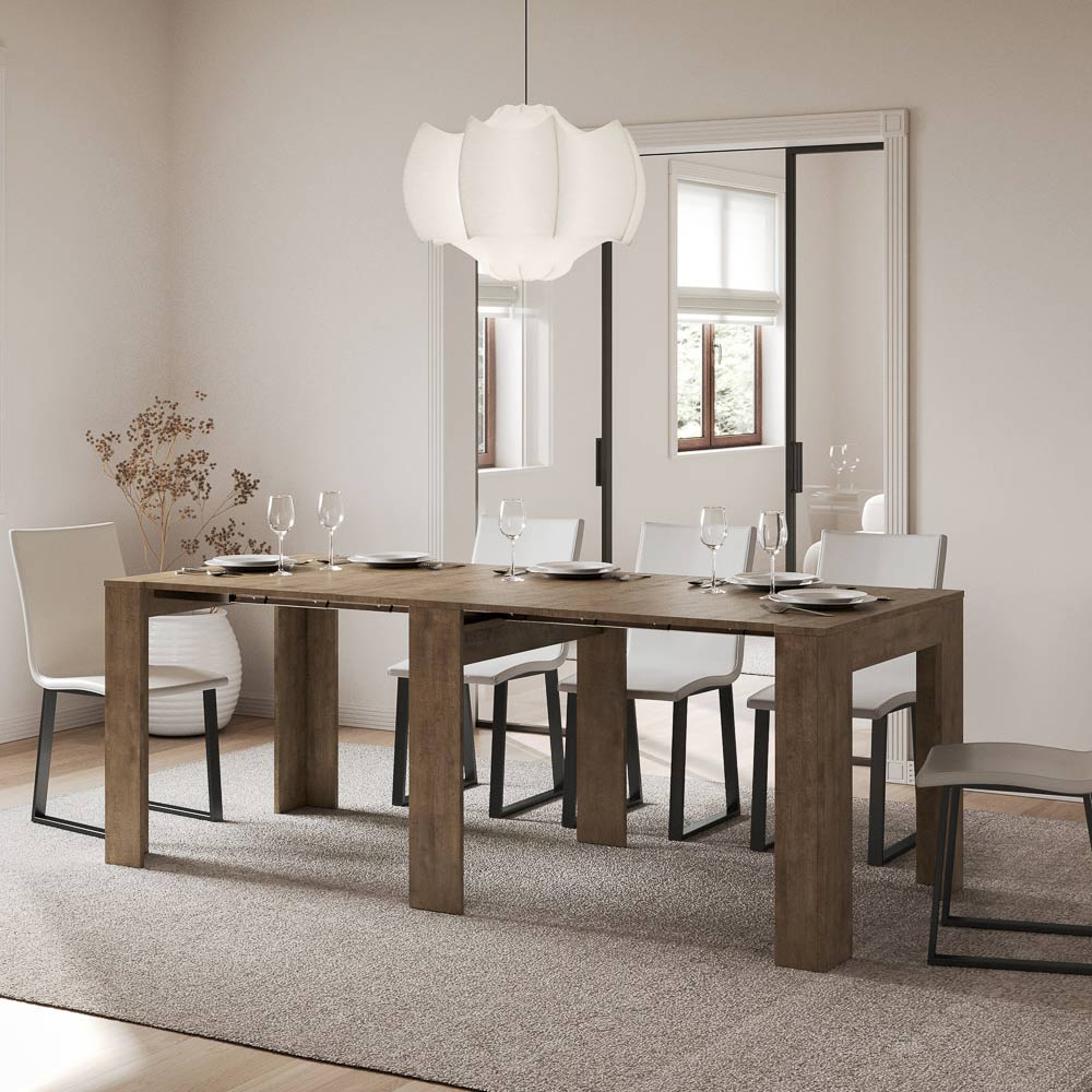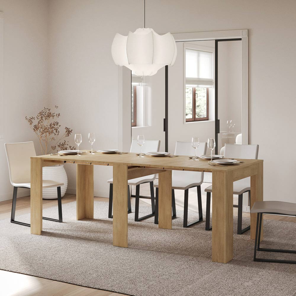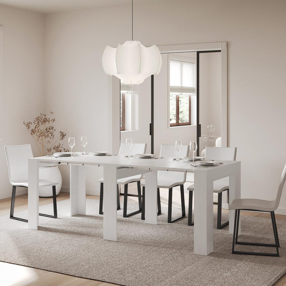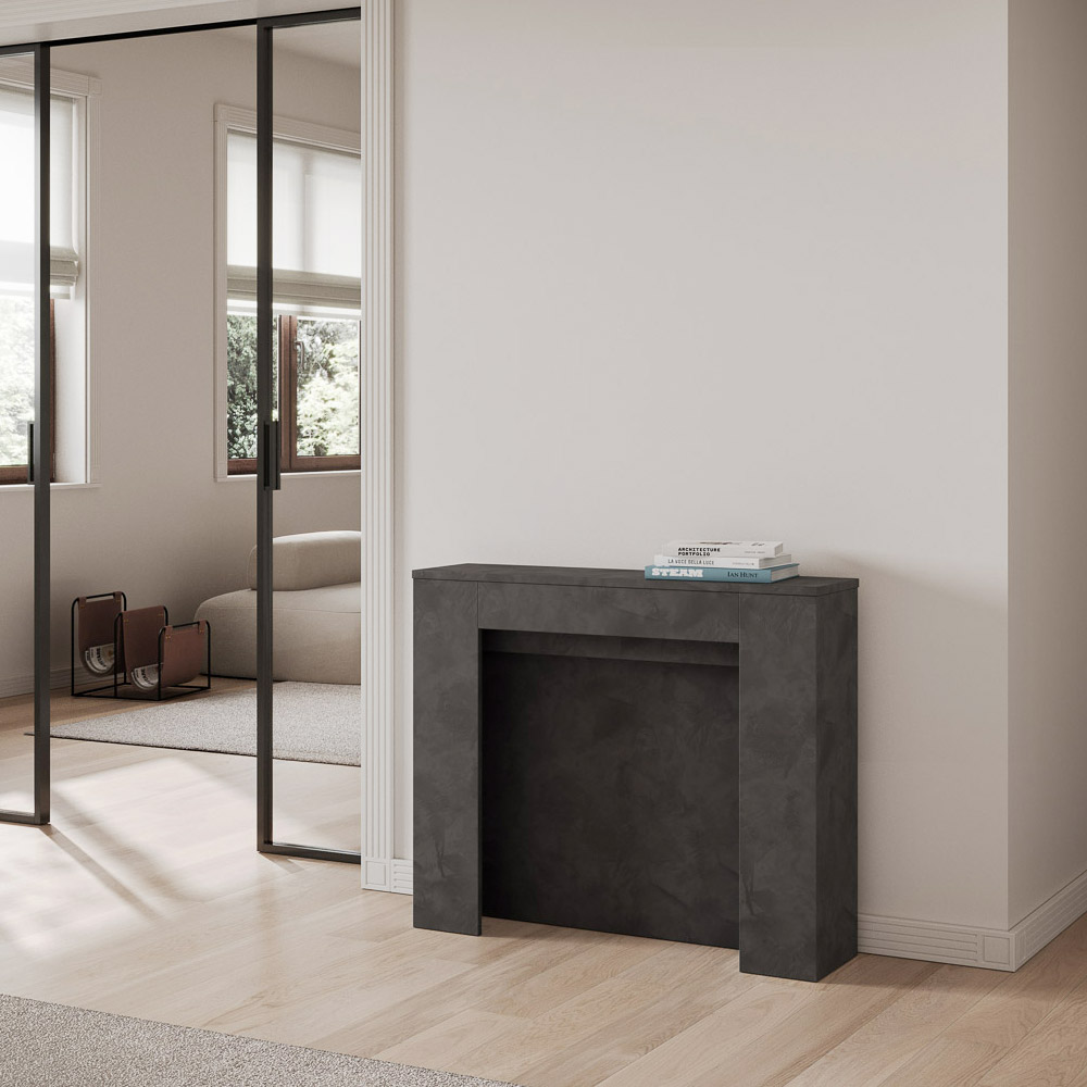 Această masă consolă extensibilă è întruchiparea designului funcțional și minimalist. Forma sa elegantă și liniile curate o fac o piesă versatilă de mobilier, ideală pentru orice spațiu, de la intrare până la sufragerie, oferind o imagine de spațiu și ordine. Masa consolă se extinde cu ușurință, transformându-se dintr-o piesă discretă de mobilier într-o masă practică, perfectă pentru a găzdui prietenii și familia la ocazii speciale. Această versatilitate o face o alegere ideală pentru cei care locuiesc în spații mici, dar nu doresc să sacrifice funcționalitatea și stilul.