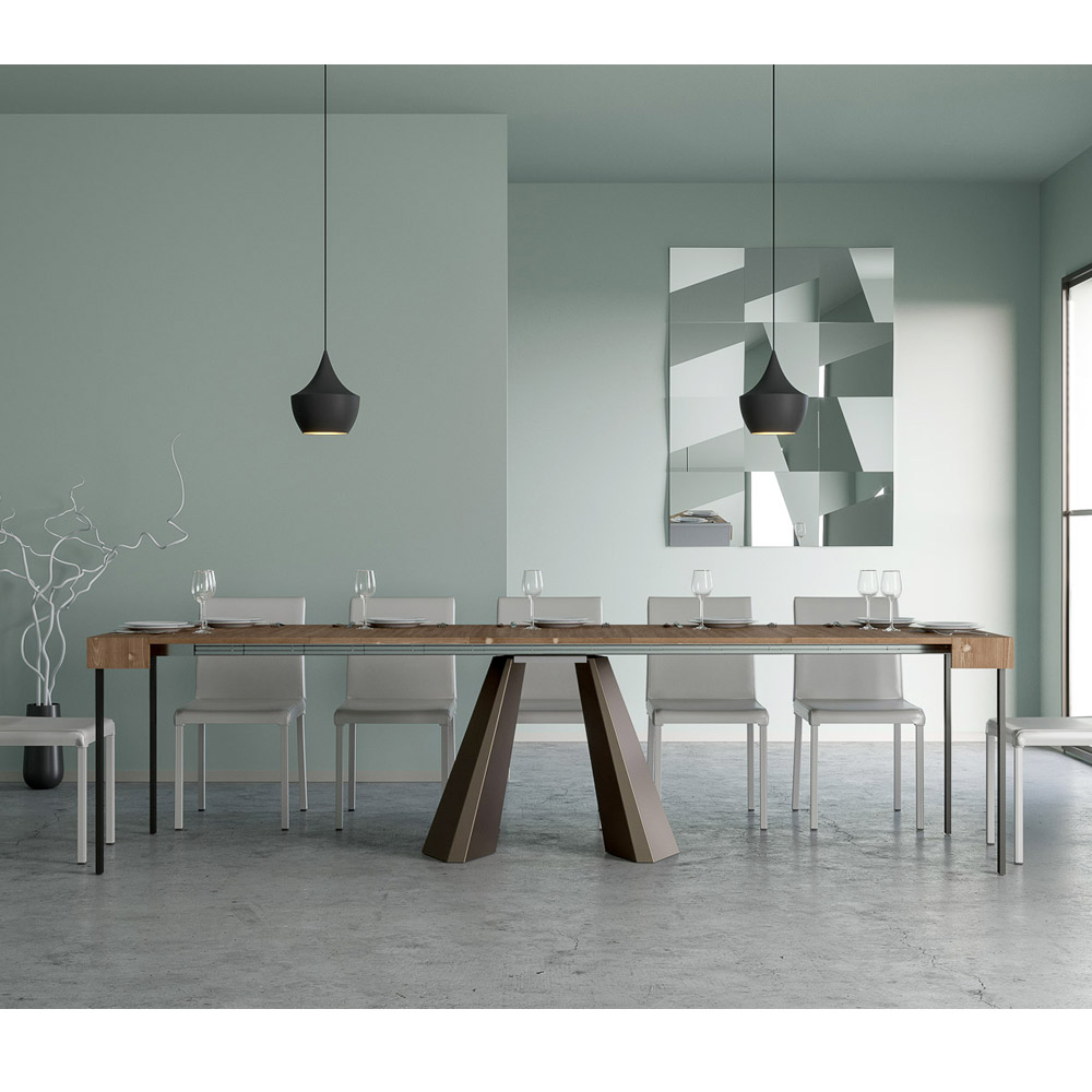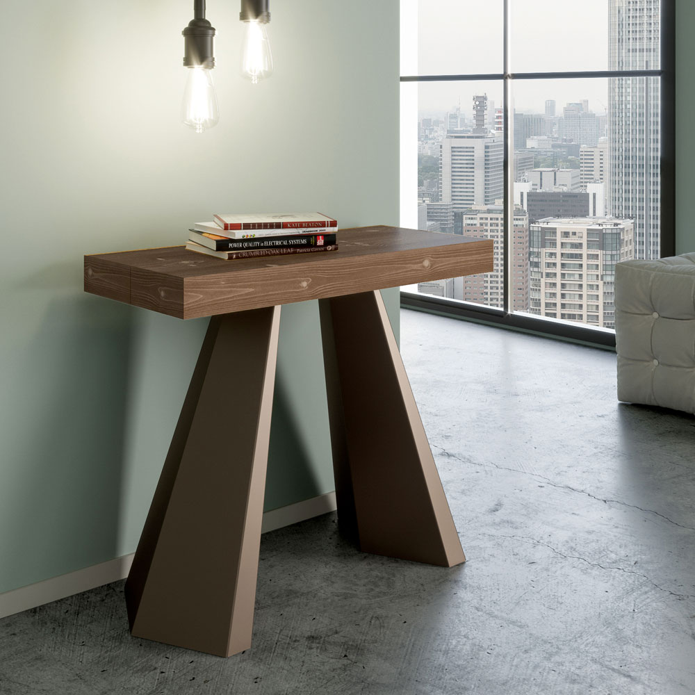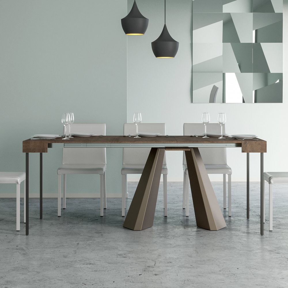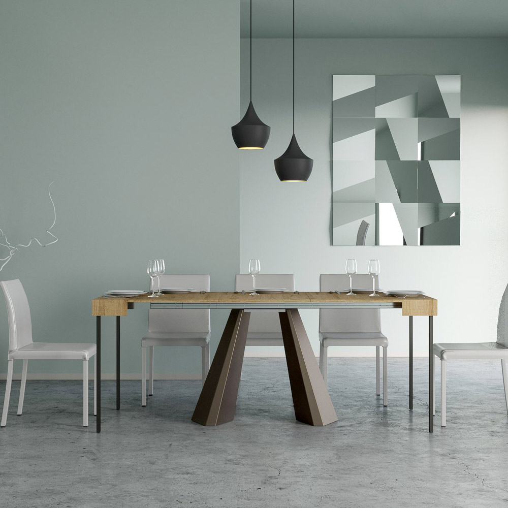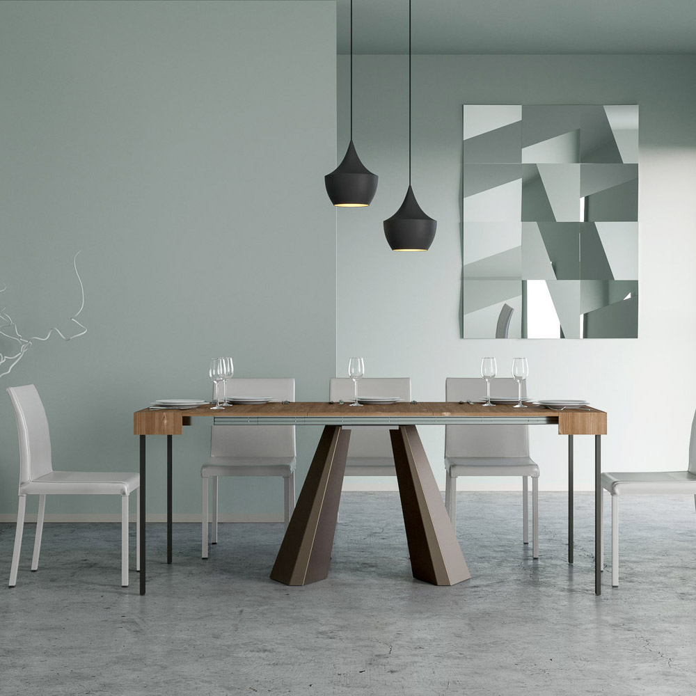 Această masă consolă extensibilă è o odă la designul contemporan și funcționalitatea dinamică. Suprafața din lemn finisat, fin lucrată pentru a scoate în evidență granulația naturală, se sprijină pe două picioare din fier rezistente și înclinate, creând un contrast vizual care è pe cât de îndrăzneț, pe atât de armonios.