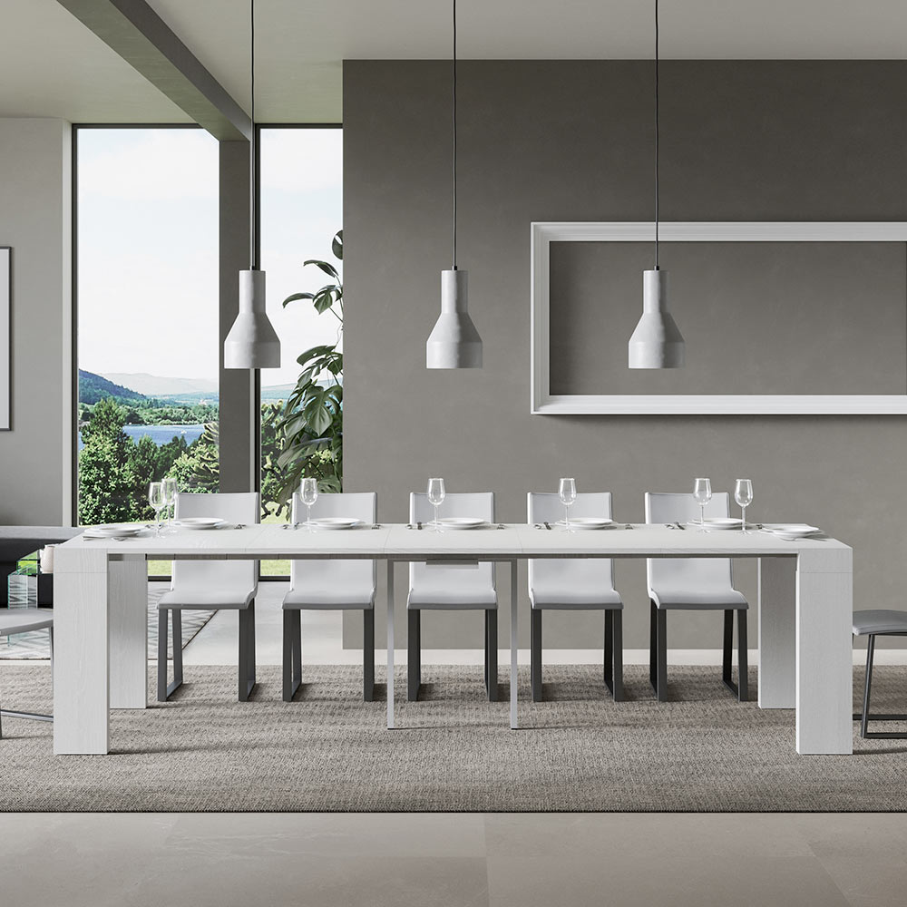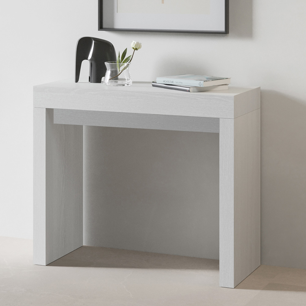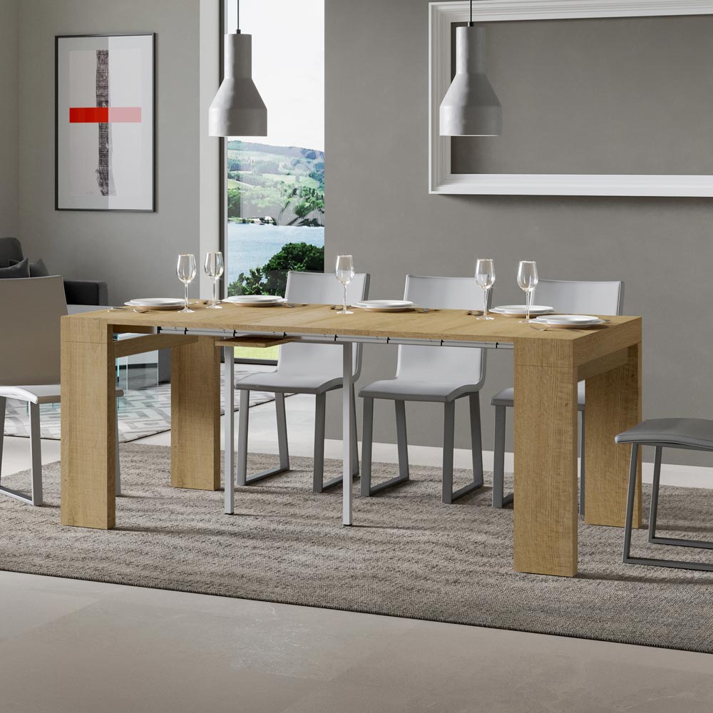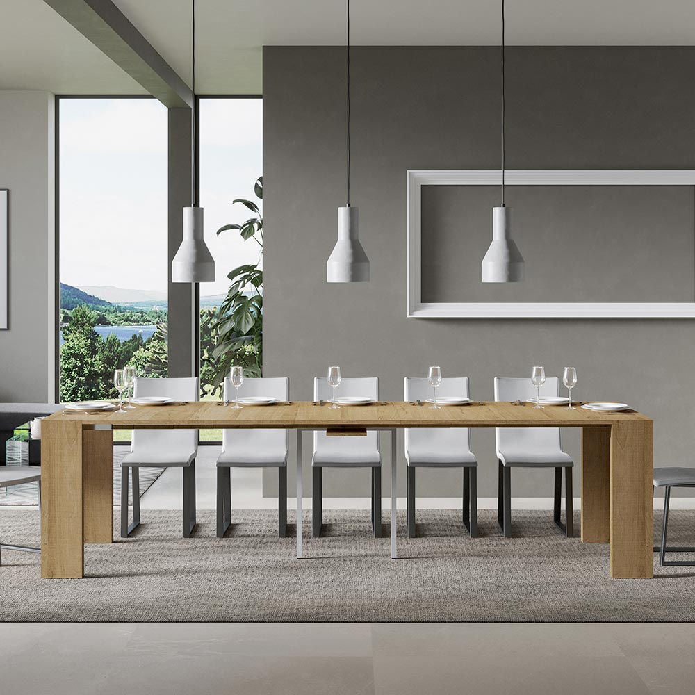 Această masă consolă extensibilă è o capodoperă a designului contemporan și a funcționalității intuitive. Blatul și părțile laterale din lemn furniruit oferă o senzație luminoasă și deschisă, ideală pentru cei care doresc să creeze un spațiu aerat și modern în același timp. Estetica sa esențială și curată îl face potrivit pentru orice mediu, perfect pentru a se potrivi într-un design minimalist sau ca un contrast într-unul mai colorat și vivid.
