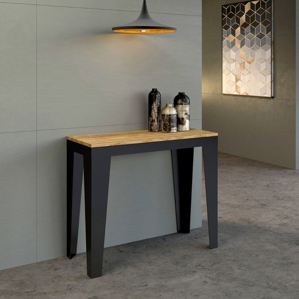 Această masă consolă extensibilă è chintesența ingeniozității și a designului elegant. Aspectul său sofisticat è dat de combinația de linii ascuțite și culori contrastante, cu picioare subțiri din metal antracit care susțin un top din lemn, creând un echilibru vizual izbitor.