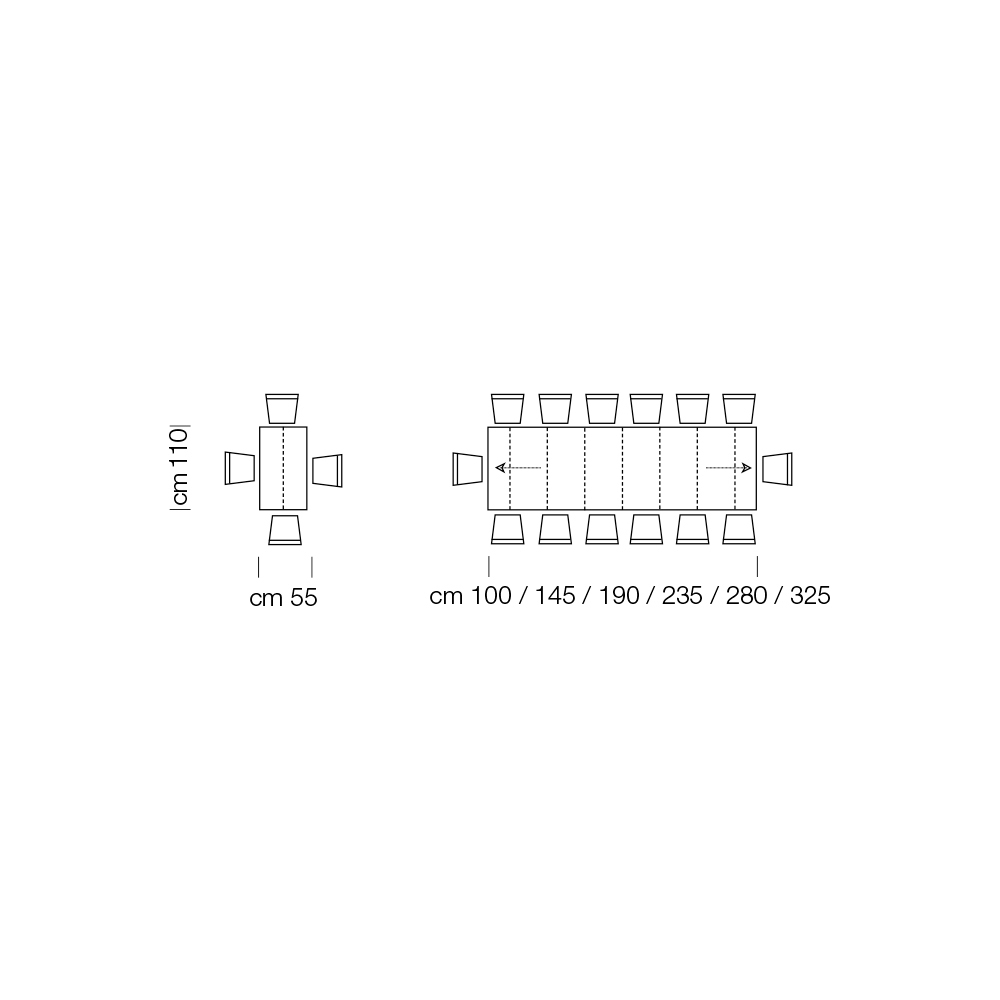 - L 55 (325) x D 110 x H 73,5 cm 14 locuri extensibilă cu șase extensii exterioare de 45 cm fiecare.