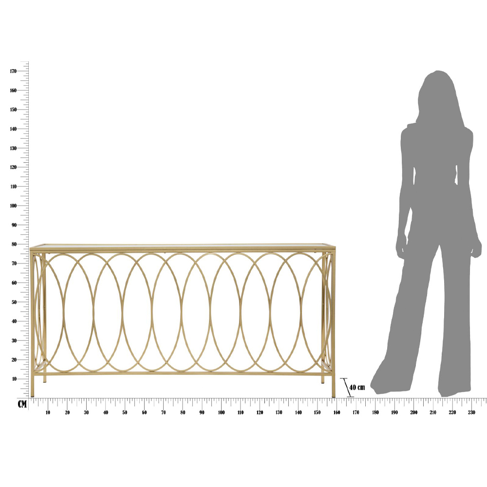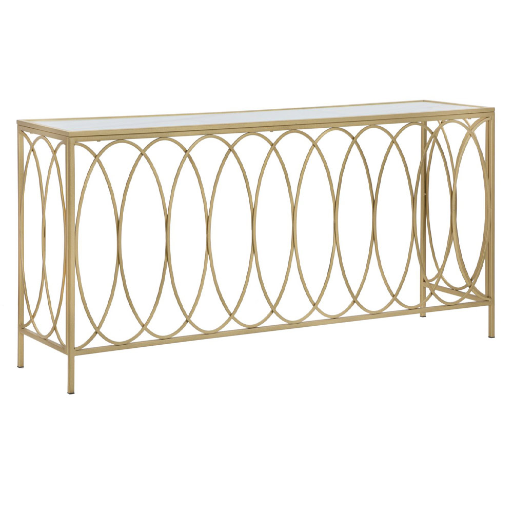 Consolă fixă pentru intrare sau sufragerie cu structură din fier cu finisaj auriu și blat din sticlă cu efect de marmură albă . Un complement caracterizat prin linii și forme simple și versatile care fac din această consolă o soluție de mobilier potrivită pentru orice situație stilistică modernă. Particularitatea sa este minunata textură geometrică care caracterizează întreaga structură a produsului, mărind valoarea și unicitatea acestuia împreună cu blatul rafinat cu efect de marmură care subliniază estetica sa sofisticată.