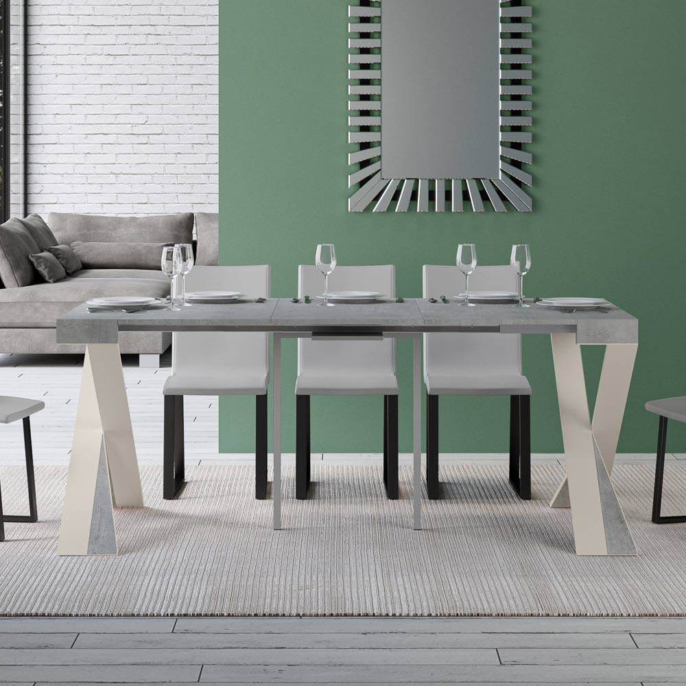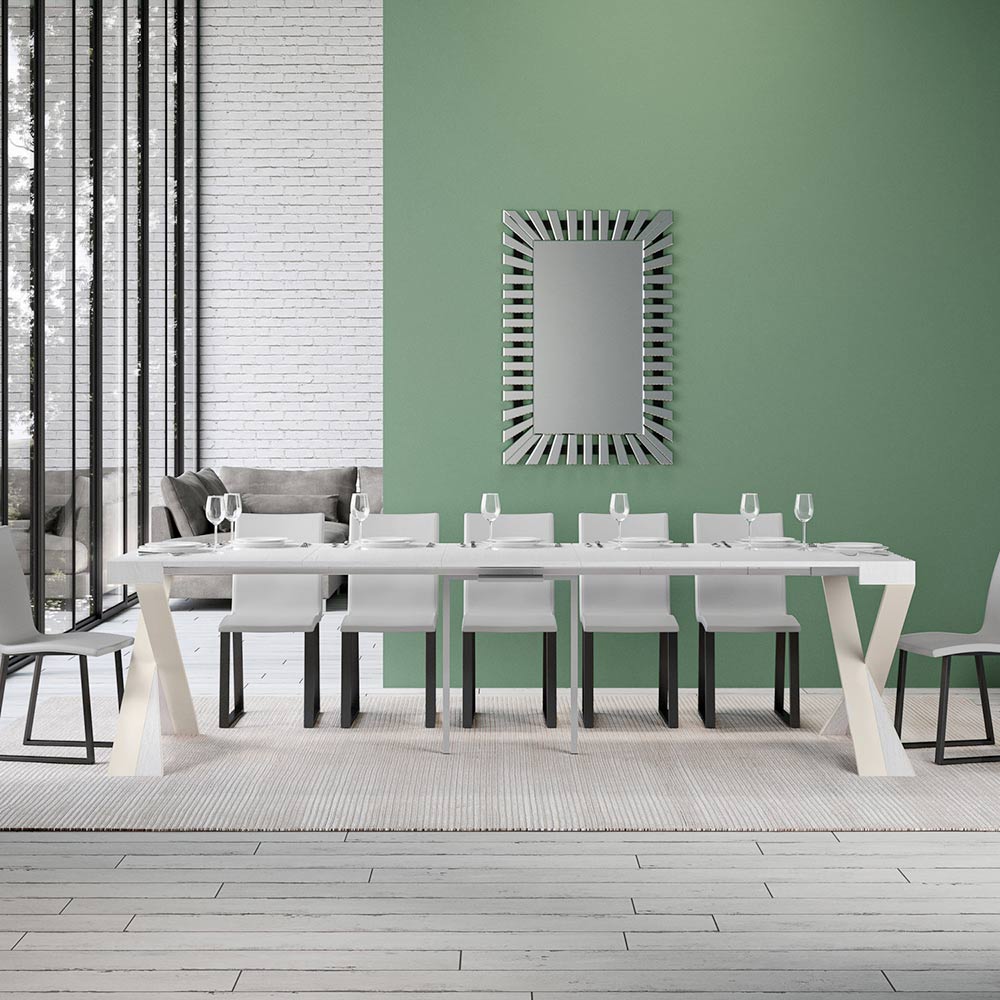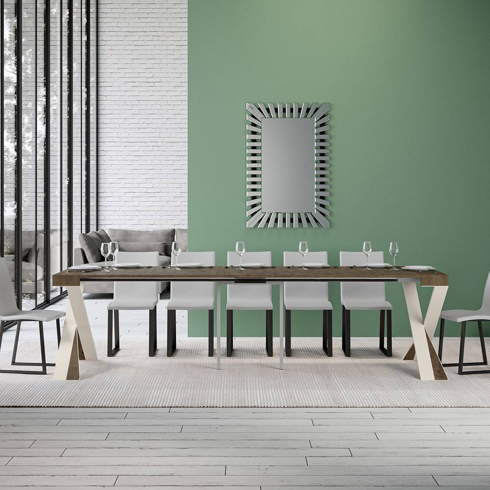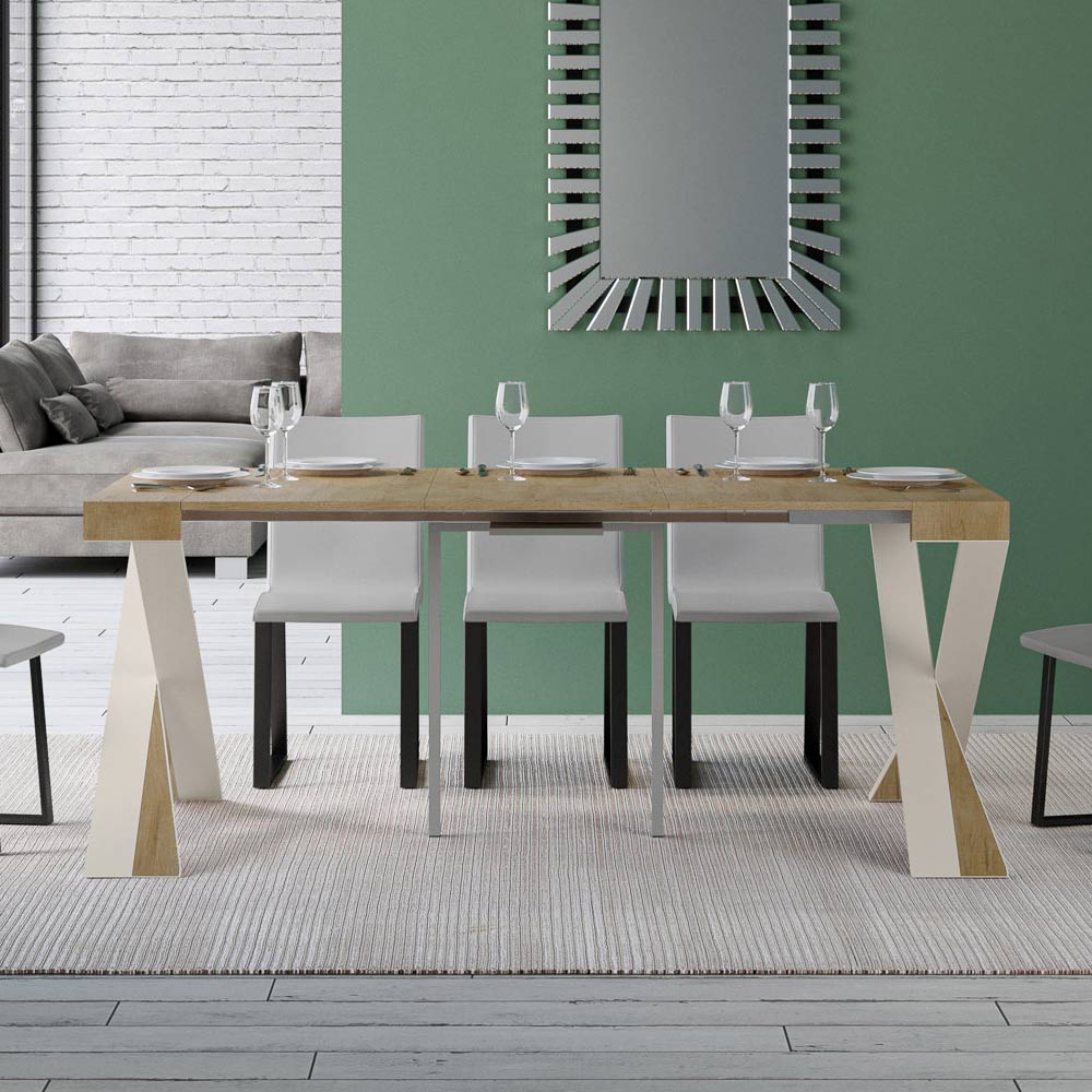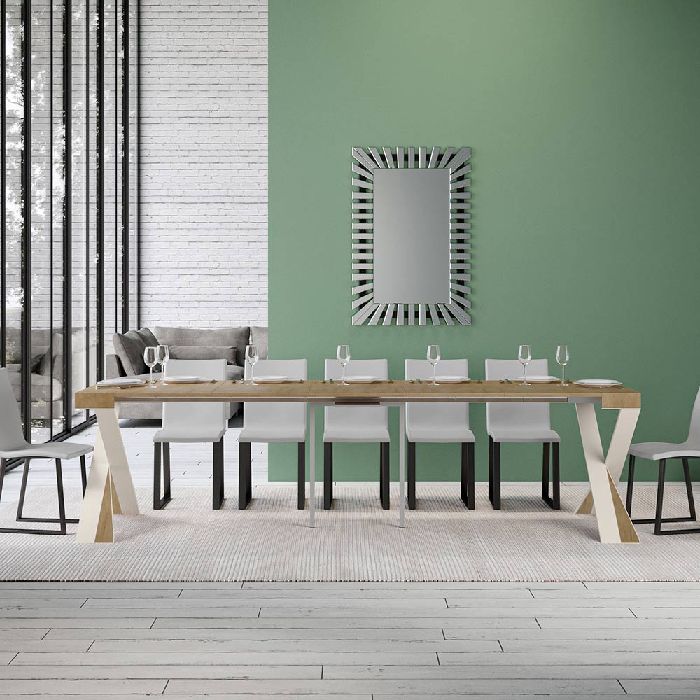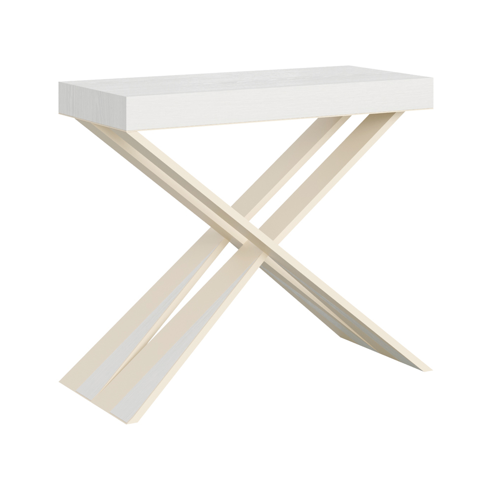 Această masă consolă extensibilă întruchipează eleganța și funcționalitatea într-un design atrăgător. É prezintă o siluetă modernă cu o bază X care nu numai că oferă un suport solid, dar adaugă și o notă de originalitate sofisticată. Blatul din lemn furniruitè un tribut adus calității Made in Italy, apreciată pentru durabilitatea și capacitatea de a rezista trecerii timpului.