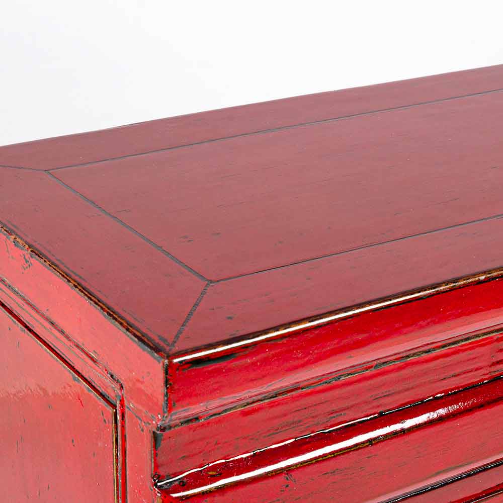 Consolă roșie din lemn de ulm cu 3 sertare în design vintage.