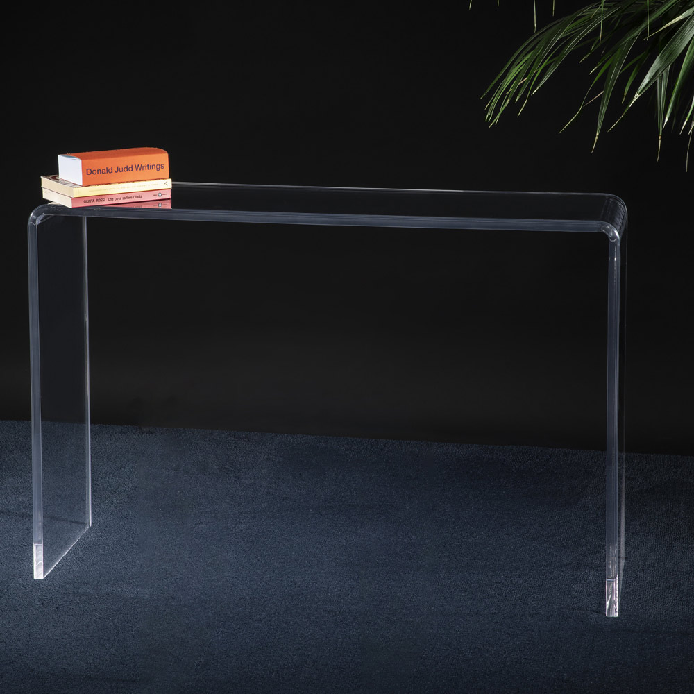 Aceasta consola este realizata integral din cristal acrilic transparent de 15 mm grosime cu un design esential, ideala in spatii clasice sau moderne.