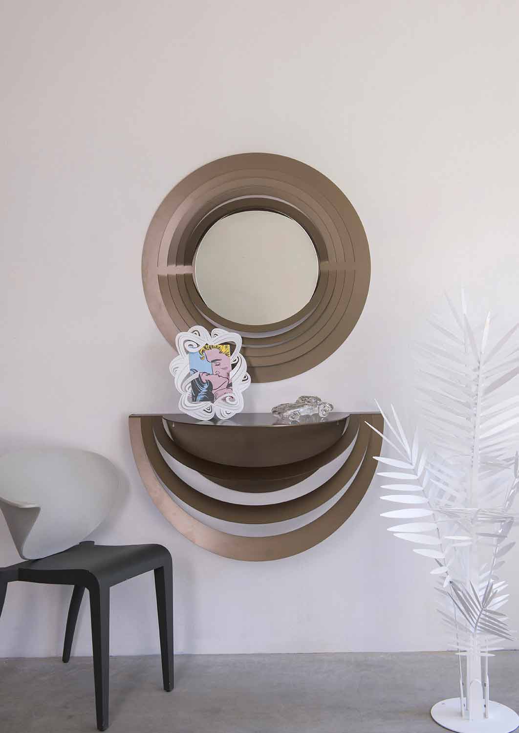 Olfeo este o sufragerie inegalabilă sau o consolă de intrare suspendată conturată de un design elegant și rafinat, care poate fi integrat în orice stil de mediu. Artizanat în Italia în fier.