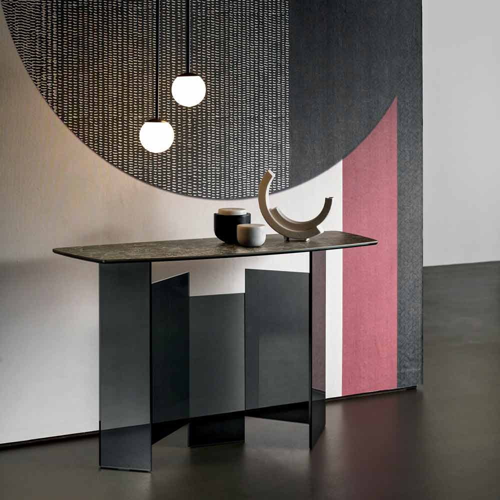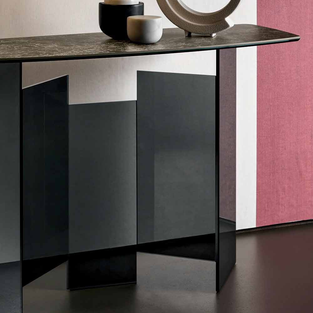 Consolă modernă pentru sufragerie cu partea superioară de ceramică Emperador sau Noir Desir și bază de sticlă, realizată manual în Italia.
