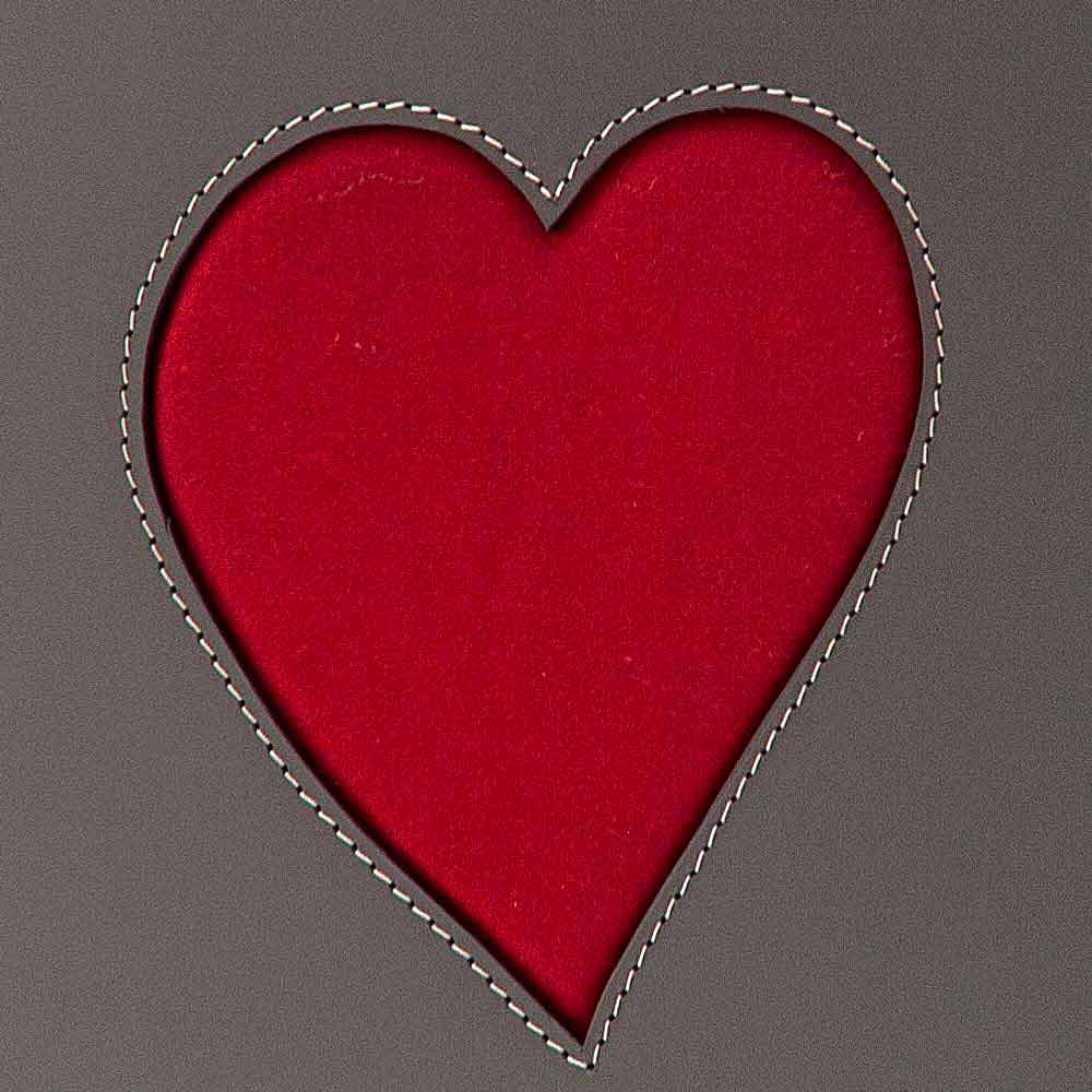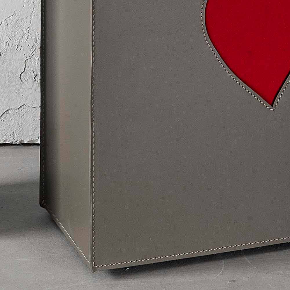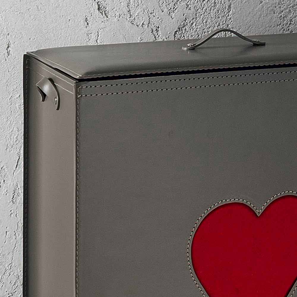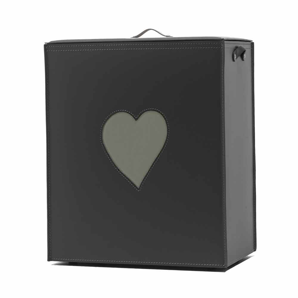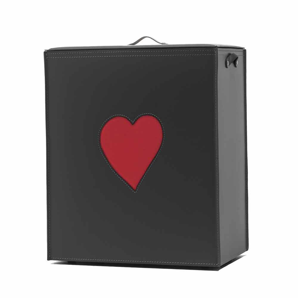 Coșul de rufe dreptunghiular realizat din piele regenerată, atât din interior, cât și din exterior, cu decoruri în formă de inimă alese din culoarea roșie sau tau. Fundul este realizat din placaj, acoperit și din piele. Echipat cu picioare practice din cauciuc. În interior există un sac de bumbac detașabil.