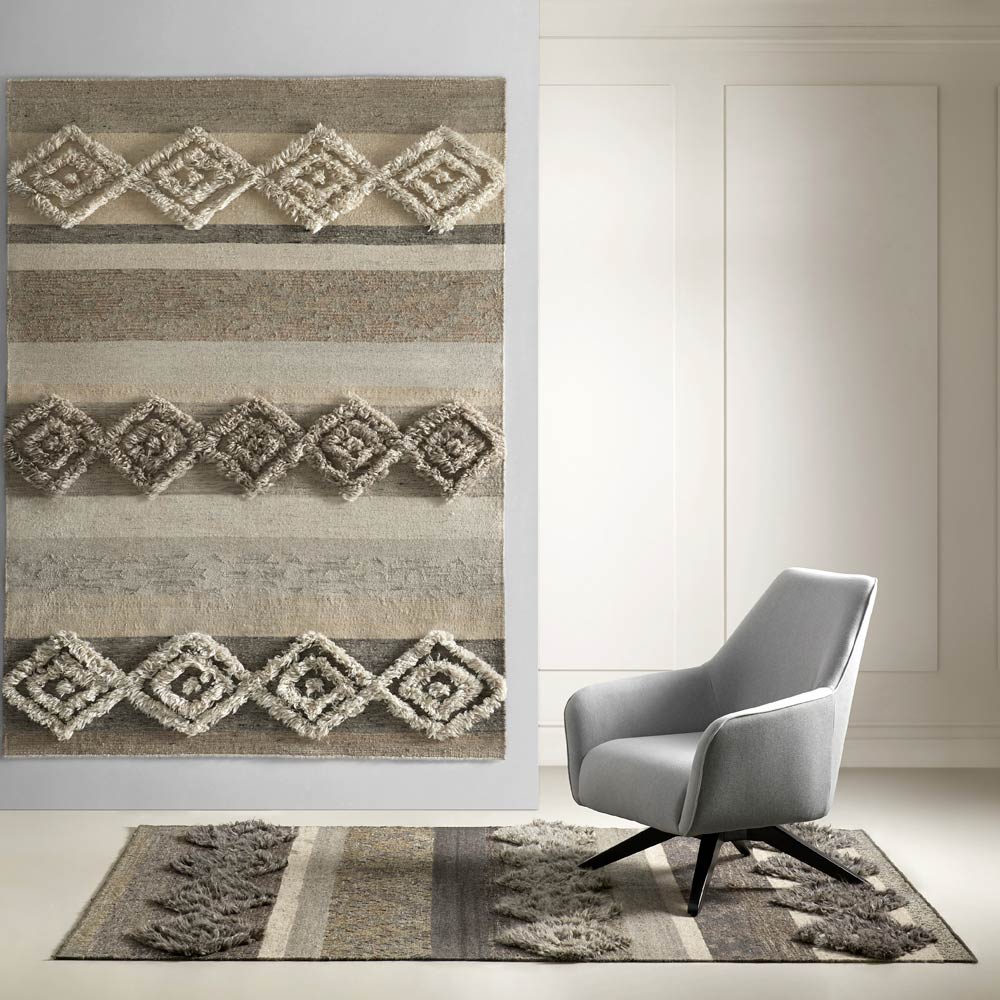 viscoză și se numește „kilim” sau un covor fără păr care nu este înnodat ci țesut manual de țesători experți. În comparație cu un covor clasic, este mai ușor și mai puțin corpolent și este perfect ca obiect decorativ pentru a îmbogăți decorul oricărei camere datorită texturii particulare și a modelelor geometrice care îl caracterizează. Combinarea culorilor disponibile cu materialele și tehnicile utilizate permit obținerea unui produs final de
