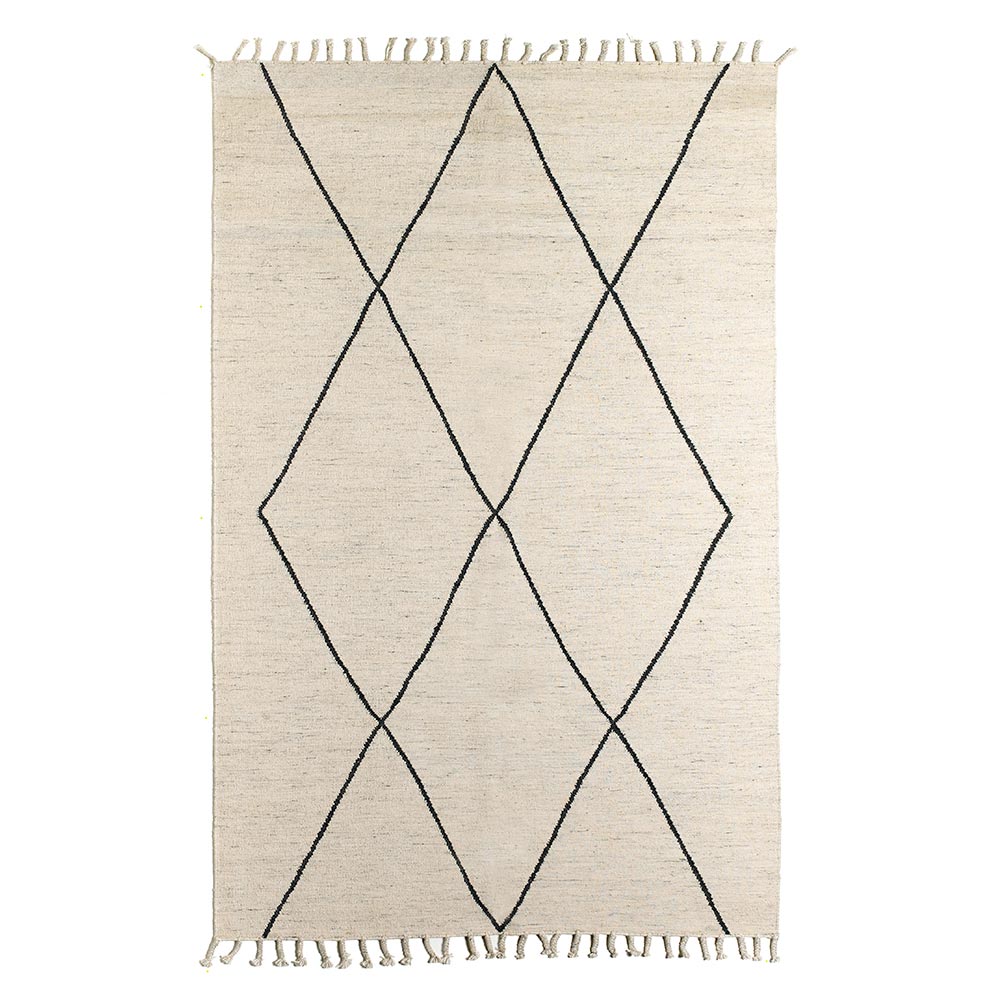 geometric în nuanțe de negru care conferă modernitate împreună cu franjurile care acoperă cele două laturi mai scurte ale covorului. Materialele și tehnicile utilizate fac posibilă obținerea unui produs final de înaltă calitate capabil să atragă atenția asupra sa, făcând fiecare mediu unic.