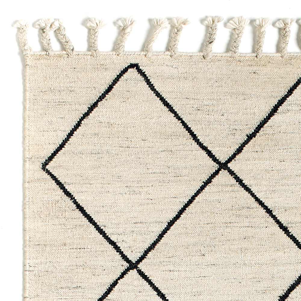 geometric în nuanțe de negru care conferă modernitate împreună cu franjurile care acoperă cele două laturi mai scurte ale covorului. Materialele și tehnicile utilizate fac posibilă obținerea unui produs final de înaltă calitate capabil să atragă atenția asupra sa, făcând fiecare mediu unic.