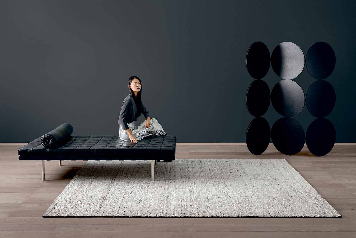 Această linie de covoare tricotate manual provine de la unirea mătase de bambus, lână și bumbac cardate manual.