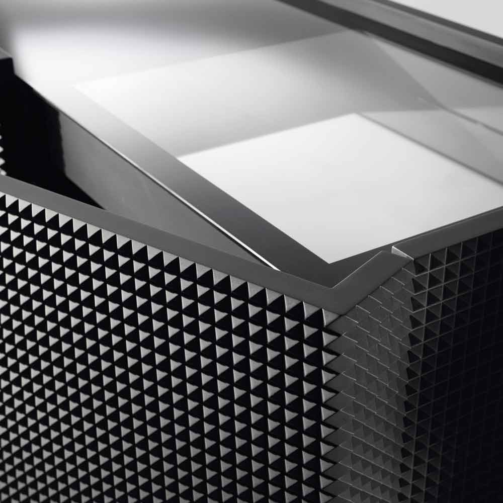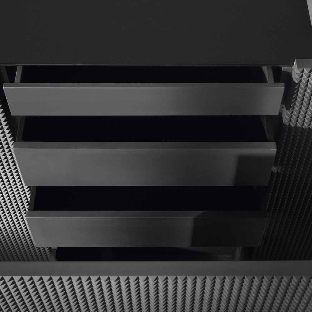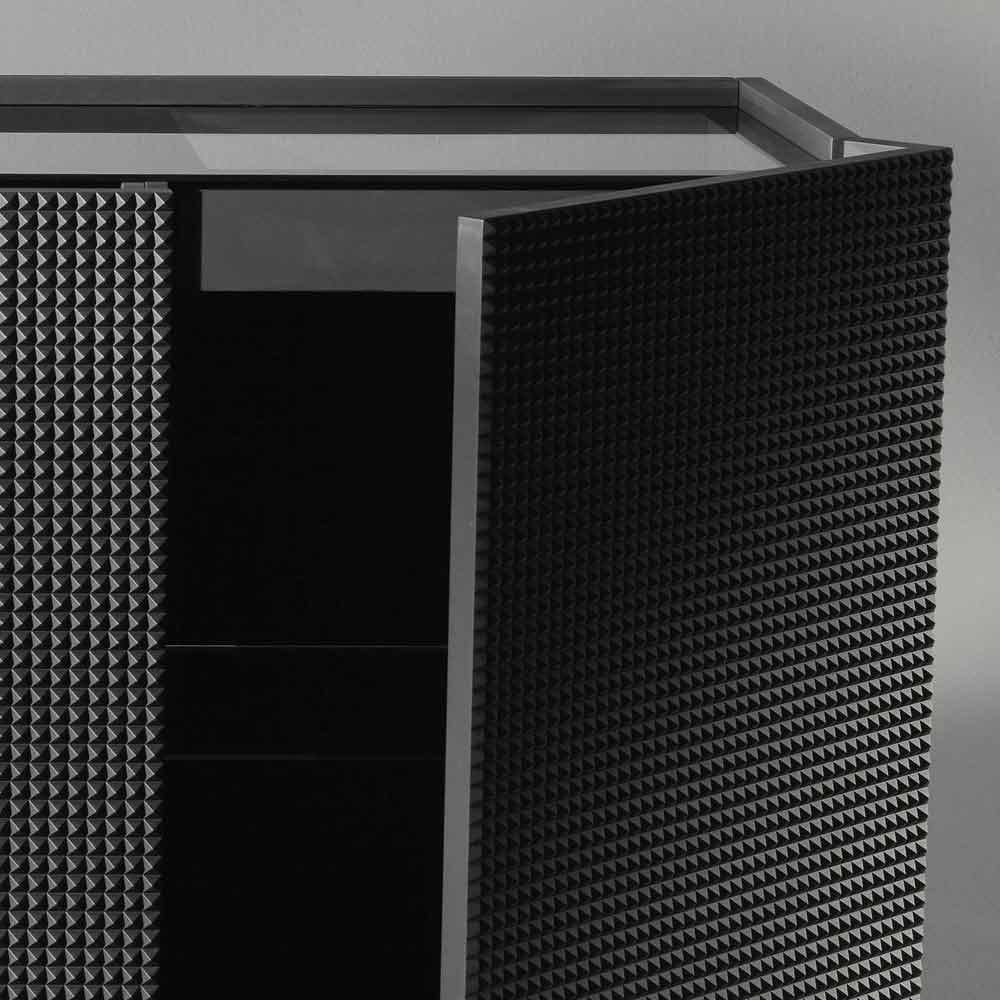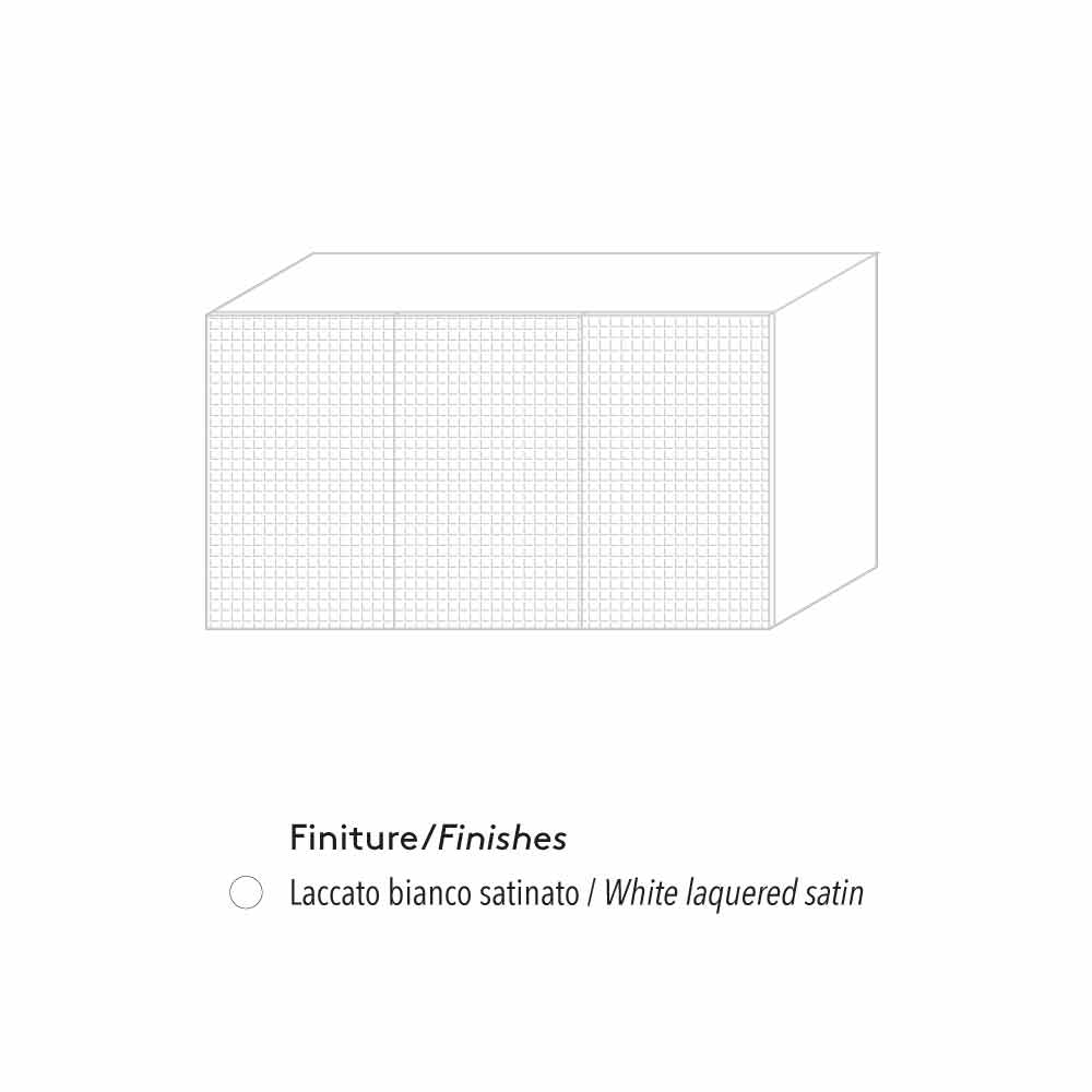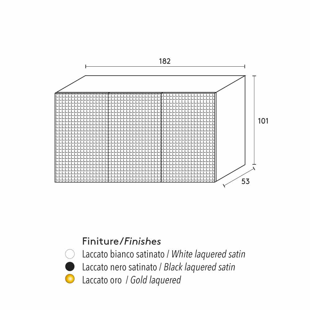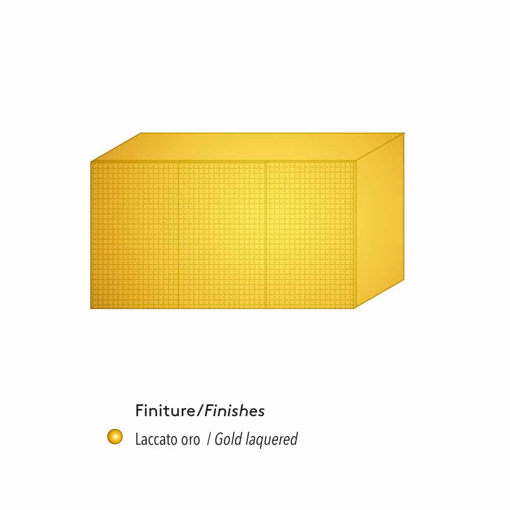 Comoda cu 2 usi de deschidere de pe părțile laterale și un sertar centrale echipate cu top din sticla pictate. În interior există 2 rafturi de sticlă. finisaje disponibile: satin lac alb, satin lăcuit negru sau auriu.