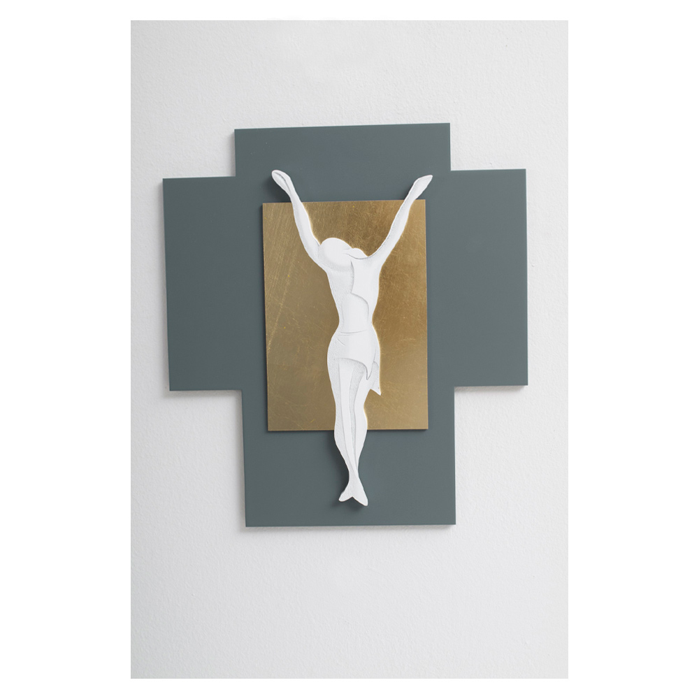 Crucifix din lemn lacuit albastru cu aplicarea unui patrat in foita de aur pretioasa si Iisus din lemn lacuit alb cu gravuri usoare cu laser.