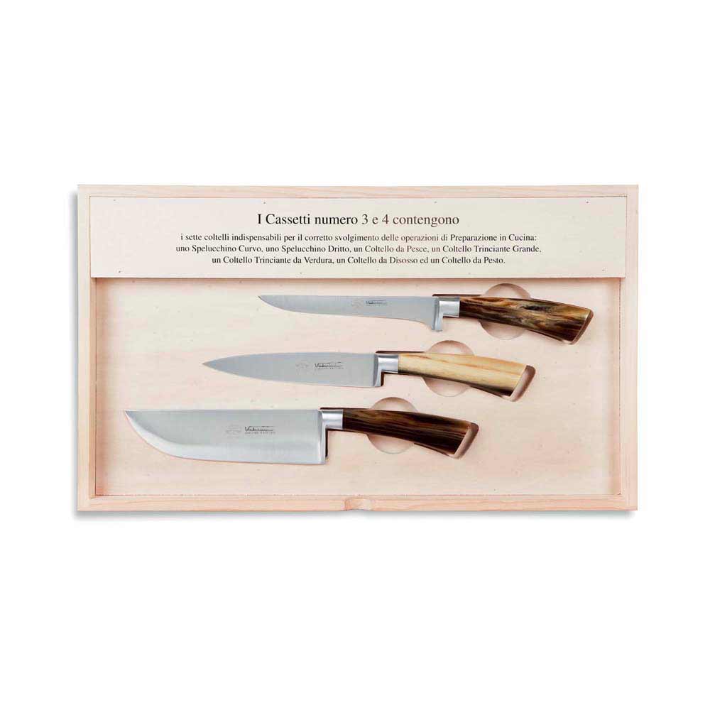Lamele sunt obținute prin forjare la cald cu un ciocan, odată ce singura modalitate de a garanta o bună calitate a tăierii (loviturile de ciocan se rup și comandă moleculele oțelului) sunt astăzi foarte apreciate pentru aspectul lor frumos și elegant. Realizate cu un mâner solid, adică lama are tangul ascuns în interiorul mânerului, au finisajul superficial al lamei din satin. Produs integral manual în cantități mici . Tratamentul termic include, de asemenea, sub-răcire la -80 ° C pentru a asigura capacitatea și durata maximă de tăiere.