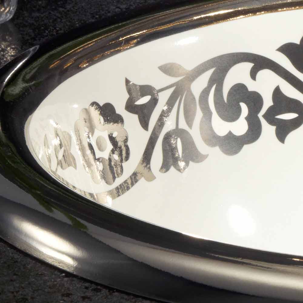 Baie încorporată în chiuvetă făcută în Italia în lut de foc, realizată manual, decorată cu dungi cu platină și flori de aur, pictată manual în platină.