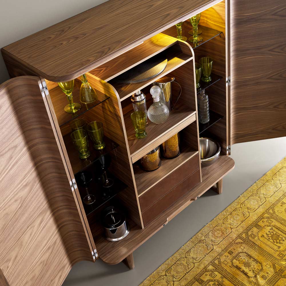 Ușile centrale sunt goale și au mânerul din piele naturală, atunci când deschidem ușile cu spoturi LED cu aprindere automată senzorizată, acestea vor da lumină cabinetului de bare.