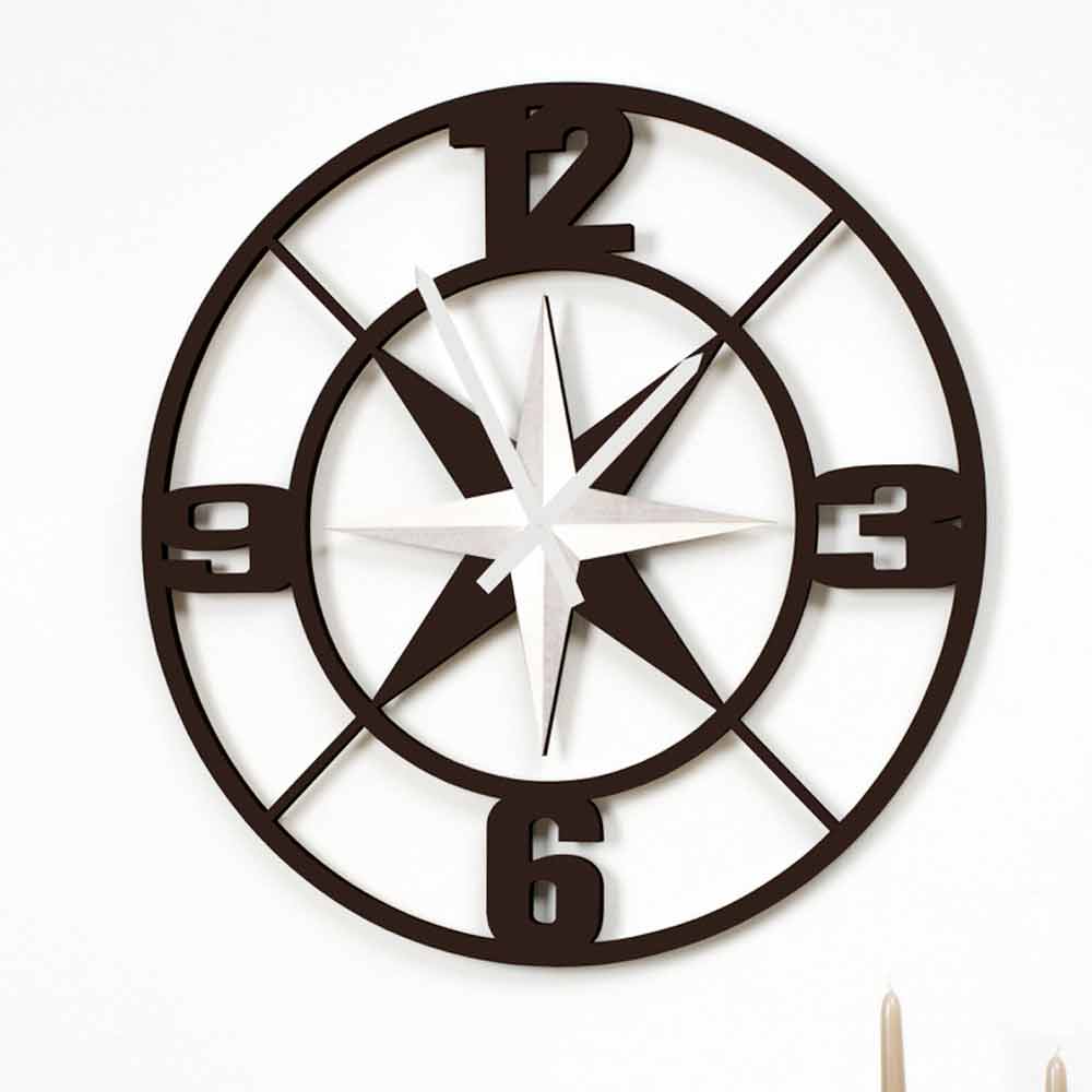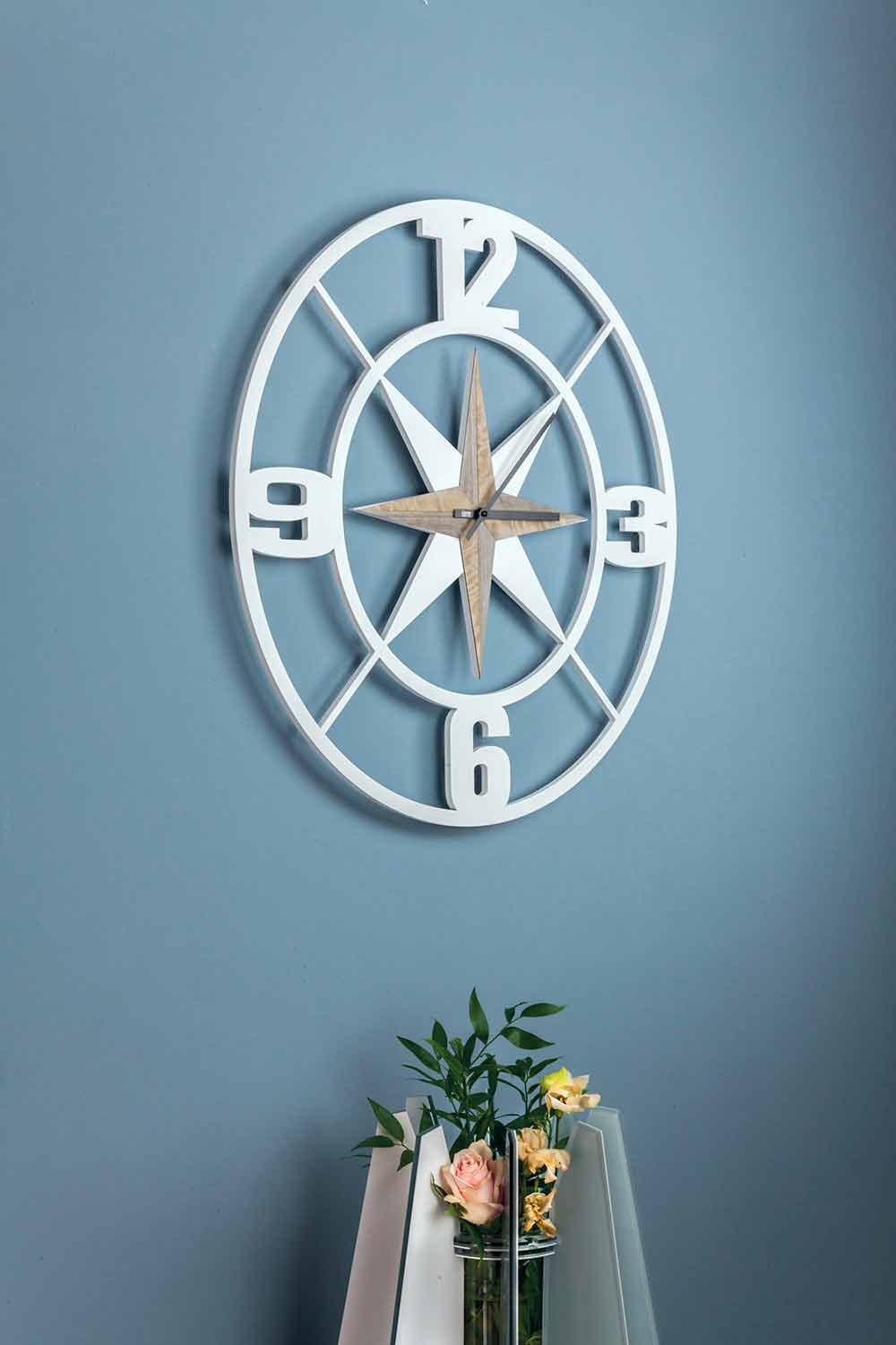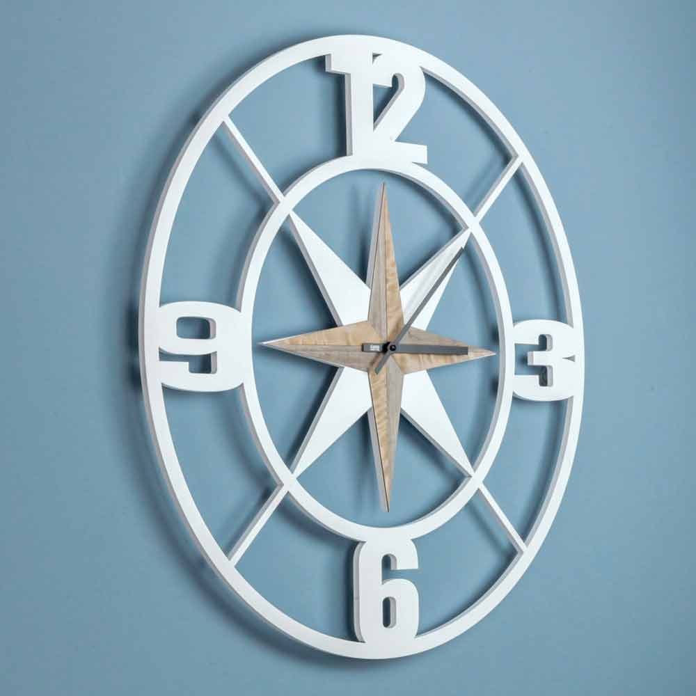 Ceas de perete mare în stil ponos, design rotund din lemn alb și maro, realizat în Italia.
