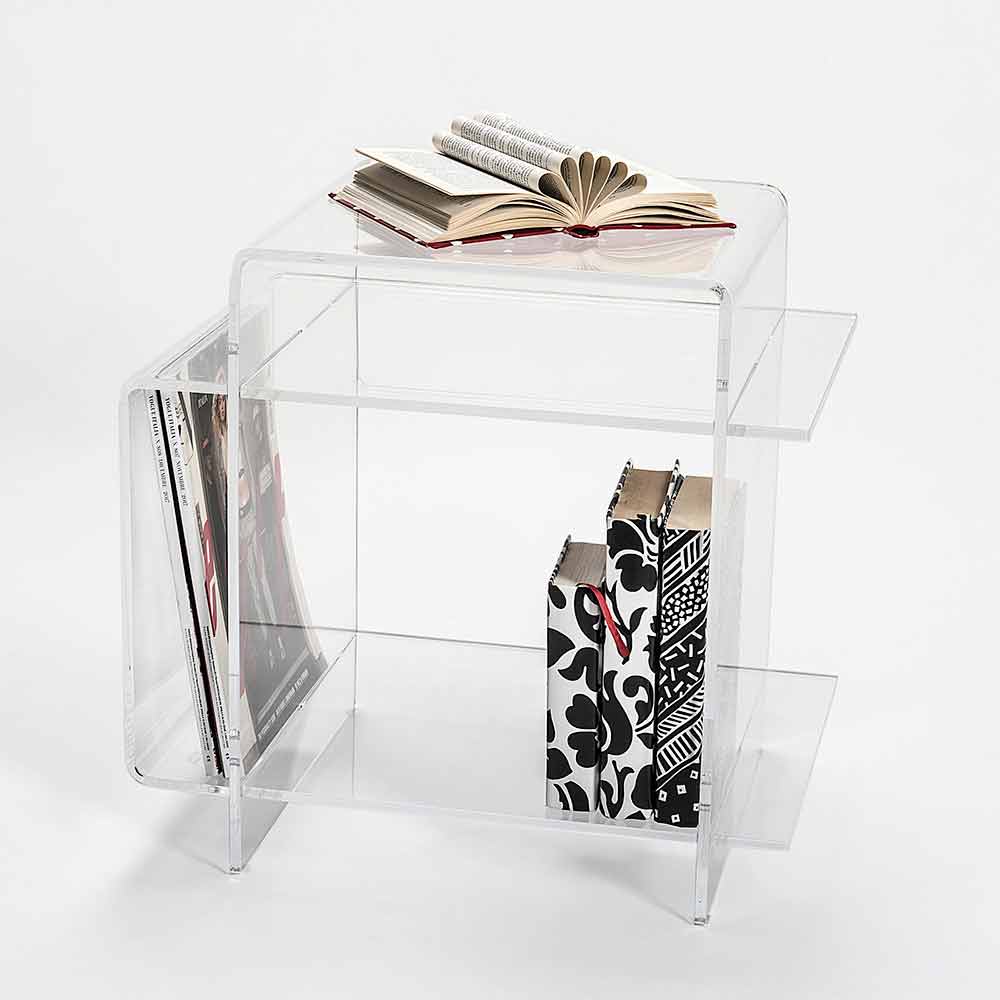 Tabel de design din plexiglas transparent realizat în Italia, Gosto Tabelul / noptiera laterală cu 3 rafturi, inspirată de geometria anilor 1970, realizată din plexiglas transparent 100% din polimer virgin, tăiat cu laser și pliat la temperaturi ridicate.