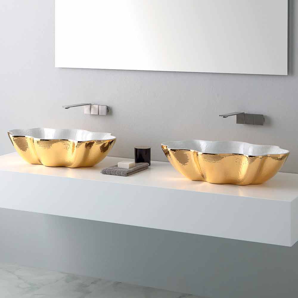 Cubo este un lavoar realizat în Italia, din ceramică extralux, în două culori de aur și alb.