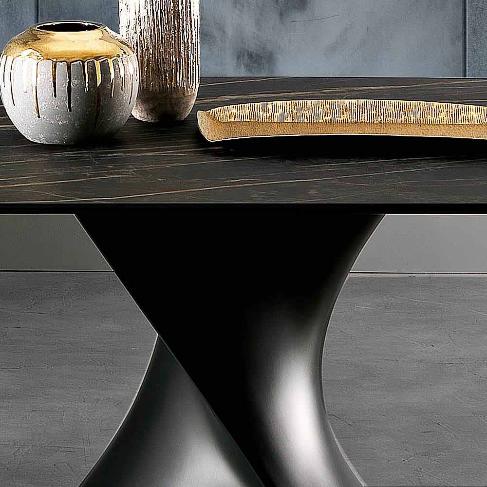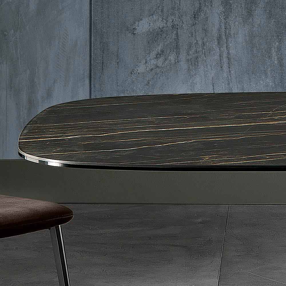 Clark este o masă fixă realizată în Italia cu o suprafață ovală din sticlă ceramică și bază poliuretanică.