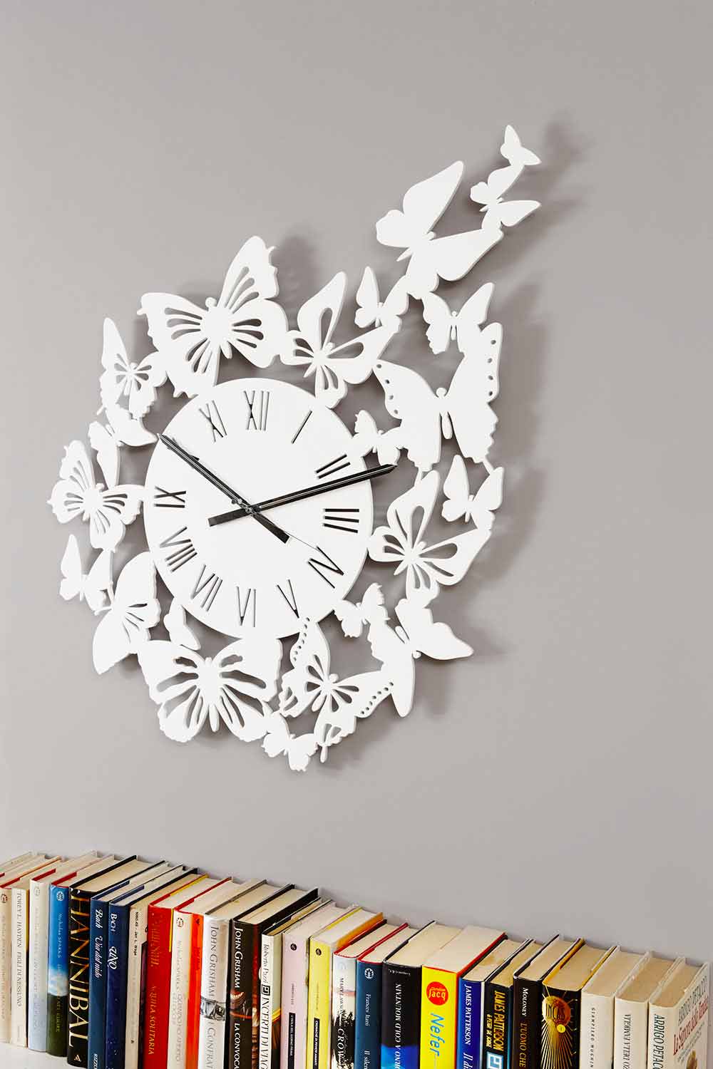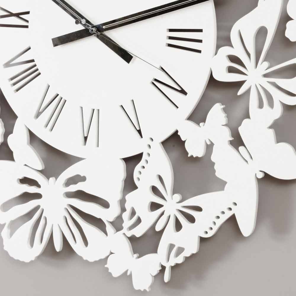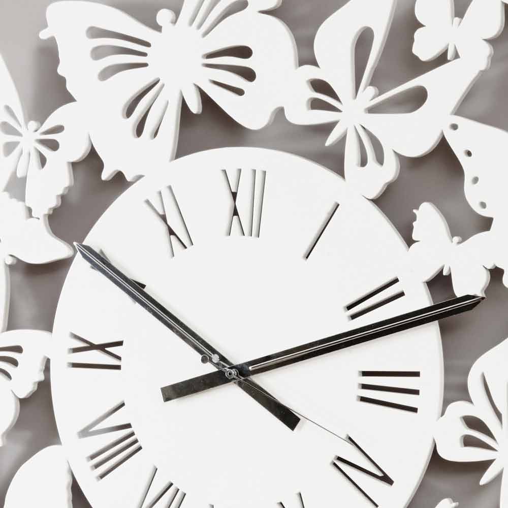Ceas de perete mare din lemn alb, negru, taupe, bej sau maro, design rotund cu fluturi fabricat în Italia.