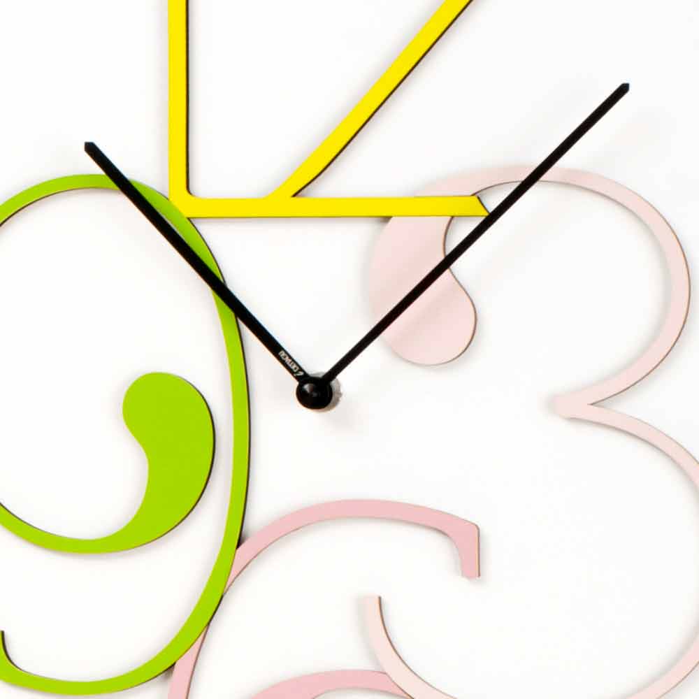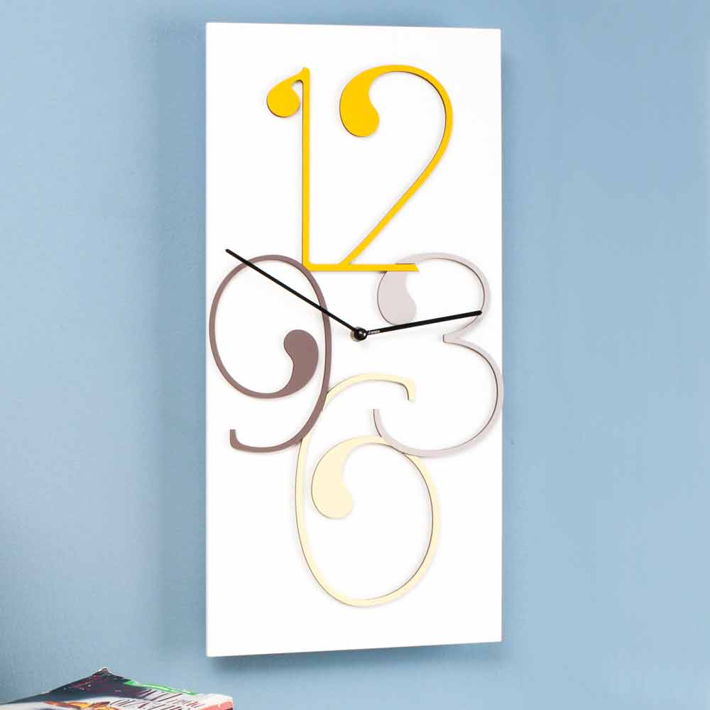 Ceas de perete din lemn alb opac, cu numere colorate, două versiuni de design dreptunghiular și modern realizate în Italia.