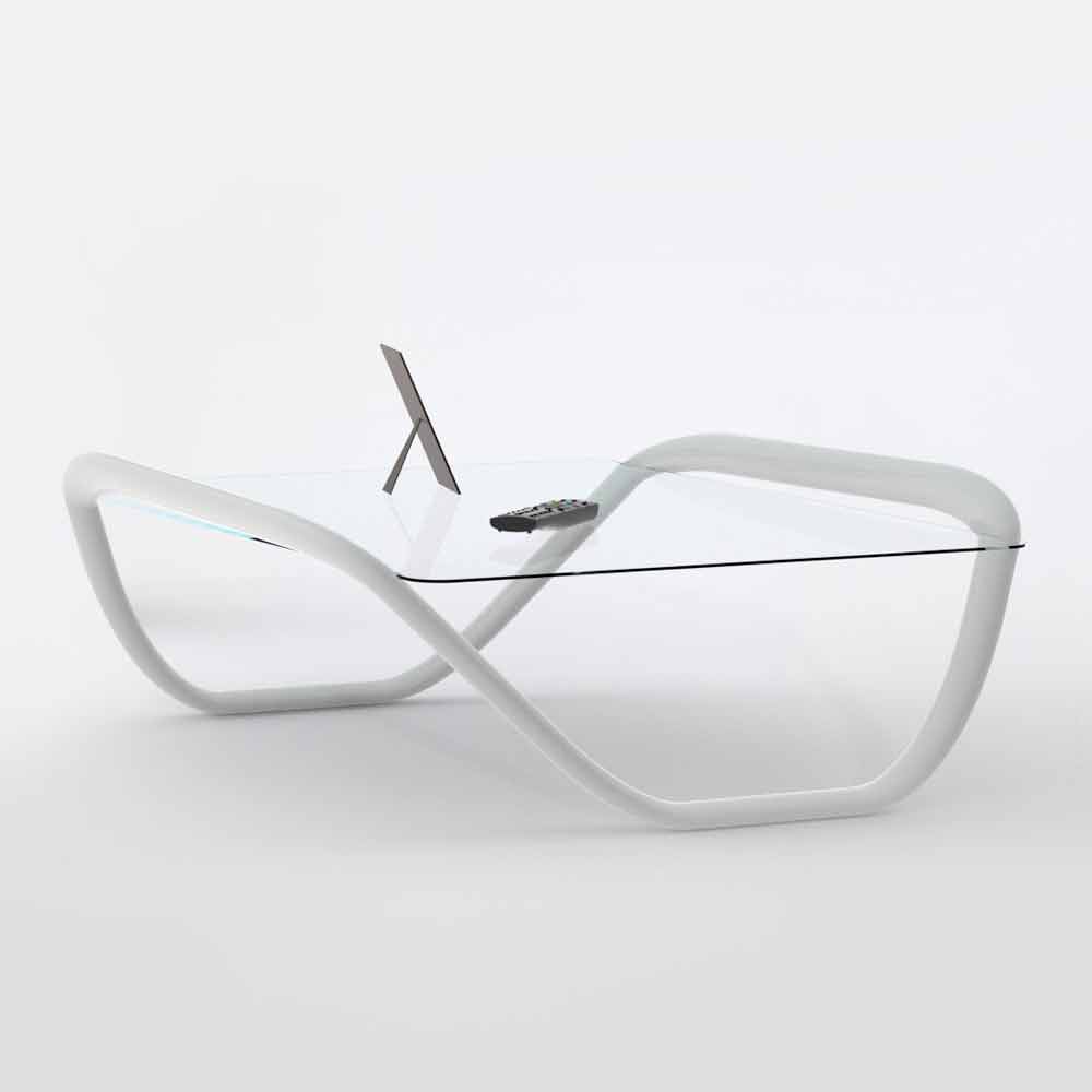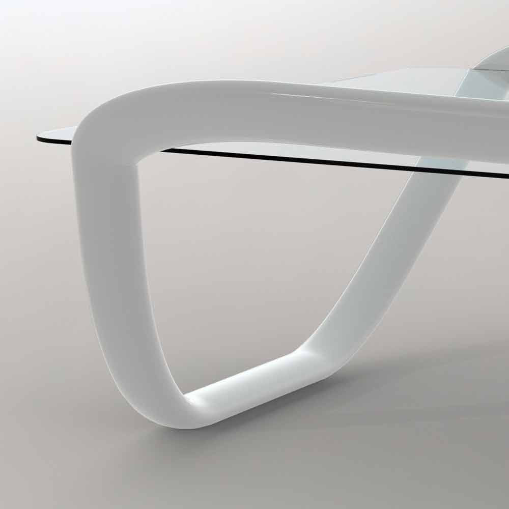 Masuta de cafea realizata cu structura Solid Surface; pentru o propunere caracterizată prin semnul simplu și sugestiv al unei linii sinuoase continue. O soluție formală esențială, capabilă să personalizeze mediul. Transparența blatului de sticlă permite sublinierea liniilor moi ale structurii. O formă unică în continuitatea spațiului. Dispunând de un finisaj lac alb lucios/mat (RAL9003).