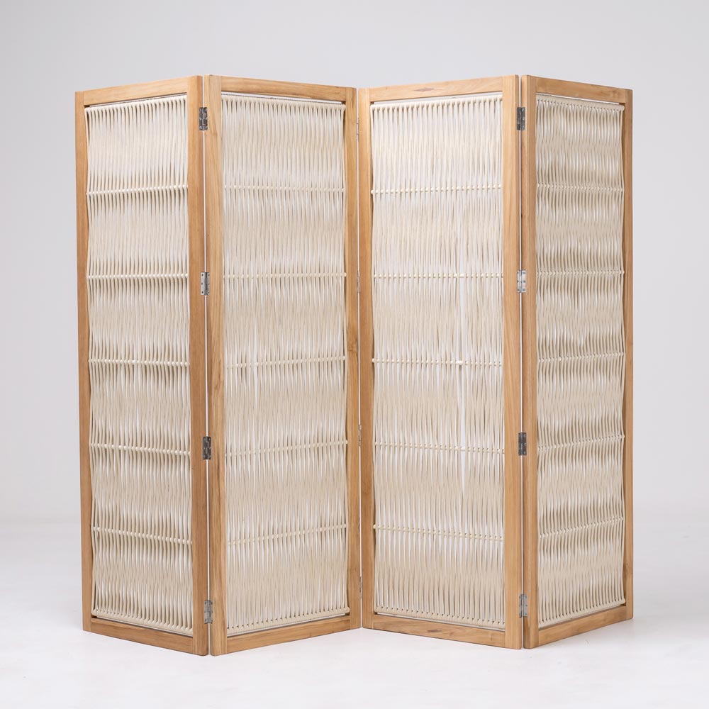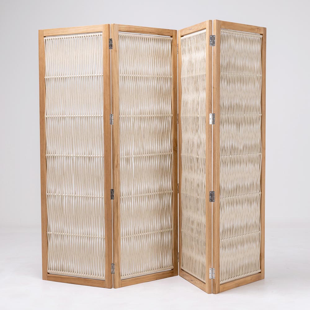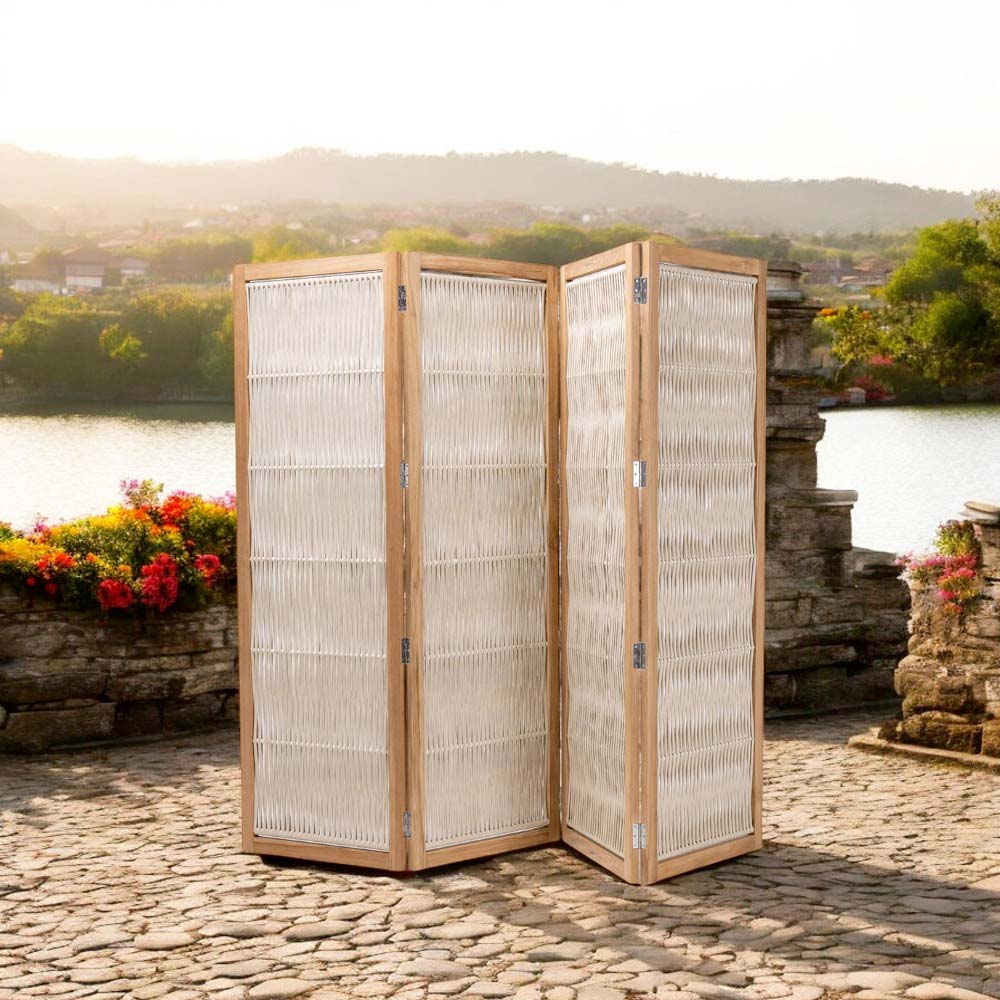 Acest despărțitor de grădină reprezintă o soluție de design elegant pentru definirea spațiilor exterioare , oferind o combinație de privire și stil. Structura din lemn de tec și aluminiu fuzionează cu panourile din foaie țesută, combinând căldura materialului organic cu funcționalitatea unei partiții mobile.