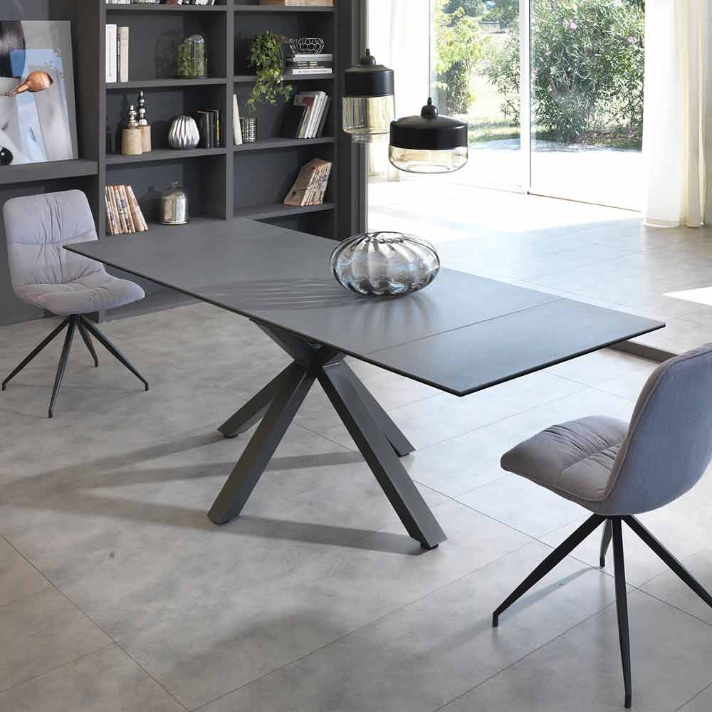 Masă extensibilă dreptunghiulară cu bază din metal vopsit mat. Blatul și extensiile din sticlă și ceramică (stratul inferior în sticlă + stratul superior în ceramică). Două extensii practice vă permit să extindeți masa până la o lungime de 240 cm.