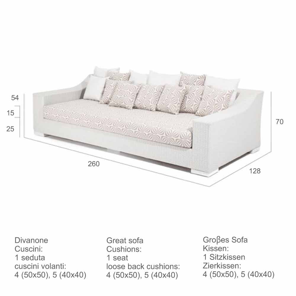 Completați cu o „spumă poliuretanică umplutură. Tapițeria constă dintr-o singură sesiune, și este împodobit cu o multitudine de perne moi, toate acoperite de o țesătură Tempotest, razele rezistente la apă și UV și sunt disponibile în diferite variante cromatice, culoare solida.