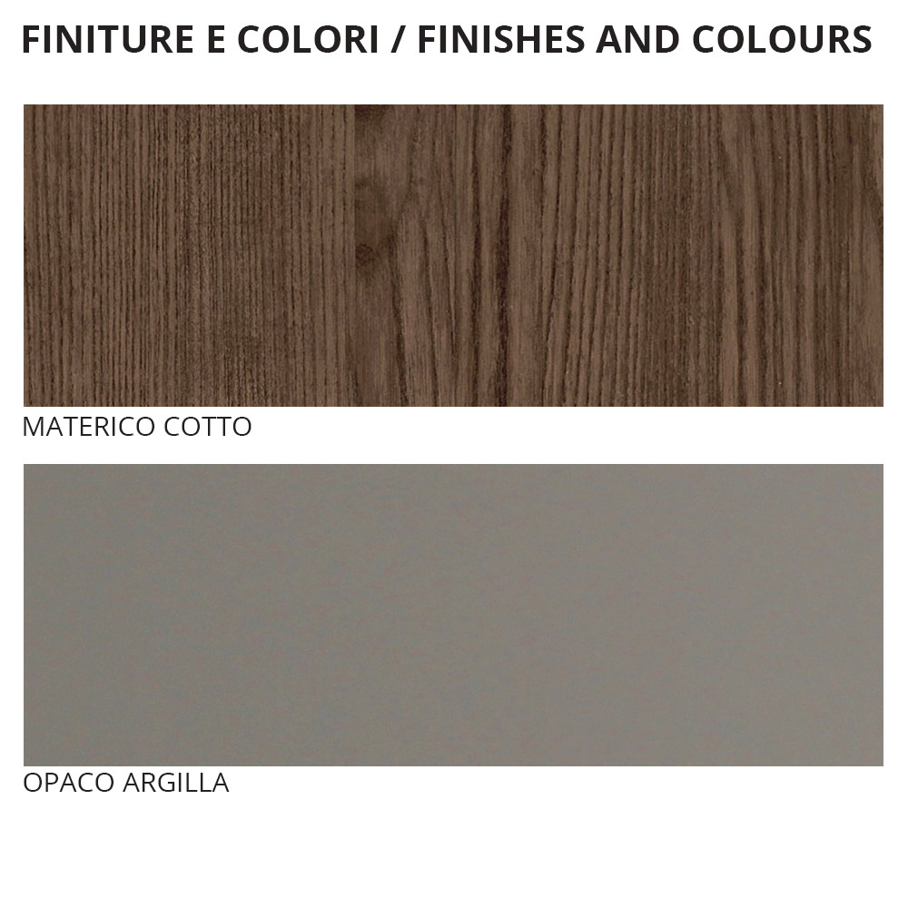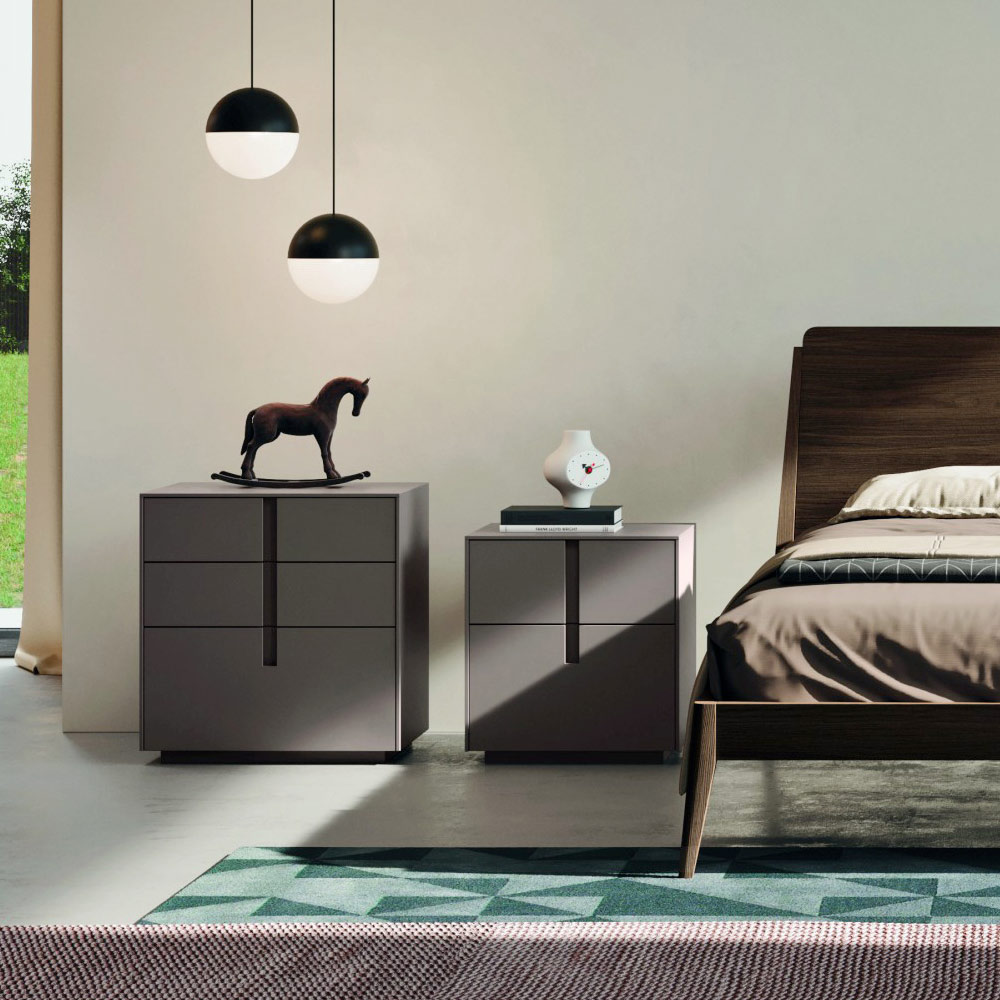 lemn lăcuit mat cu un finisaj din lut echipat cu 2 sertare practice care pot fi deschise printr-o canelură poziționată pe față, o a treia noptieră și o comoda cu 3 sertare cu aceeași deschidere de sistem realizată în același finisaj. Această soluție combină
