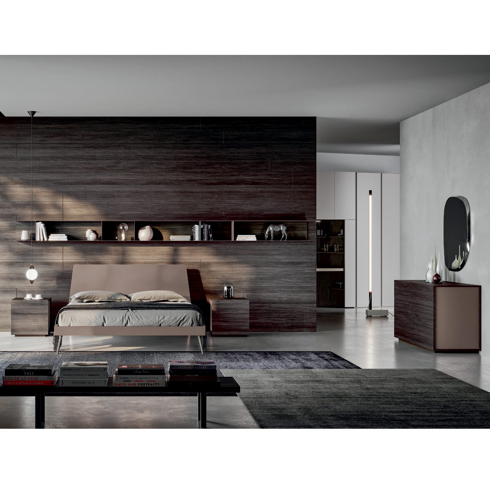 stil sobru și rafinat caracterizează această compoziție de mobilier pentru zona de dormit, ideală pentru cei care caută un design capabil să îmbogățească și să revoluționeze estetica camerei într-un mod exclusiv și cu personalitate. Patul, protagonistul incontestabil al mediului înconjurător, apare ca o pată plină de viață inserată într-un context simplu și în același timp unic în care finisajele se joacă în