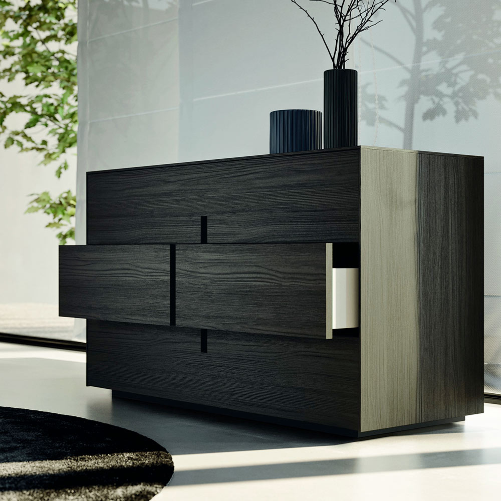 picioare din lemn cu finisaj material cărbune , o noptieră cu 2 sertare, o comodă cu 3 sertare și 2 sertare înalte cu 6 sertare în