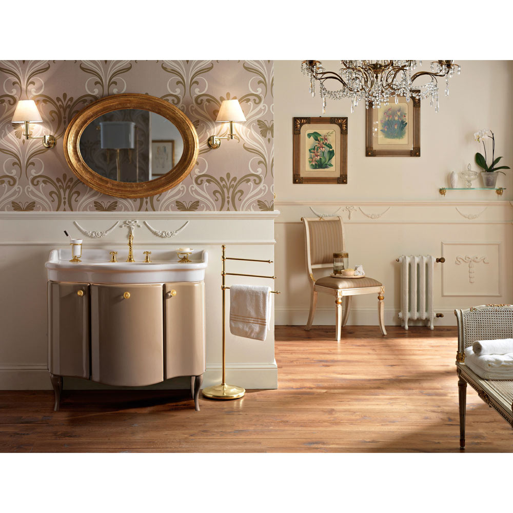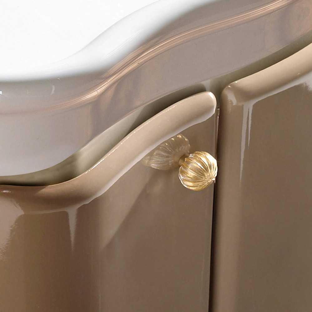 Dulap de baie din MDF cu două uși și un sertar lăcuit lucios caramel bicolor cu structură fildeș , cu chiuvetă ceramică albă . Butoanele și chiuveta din alamă sunt incluse.