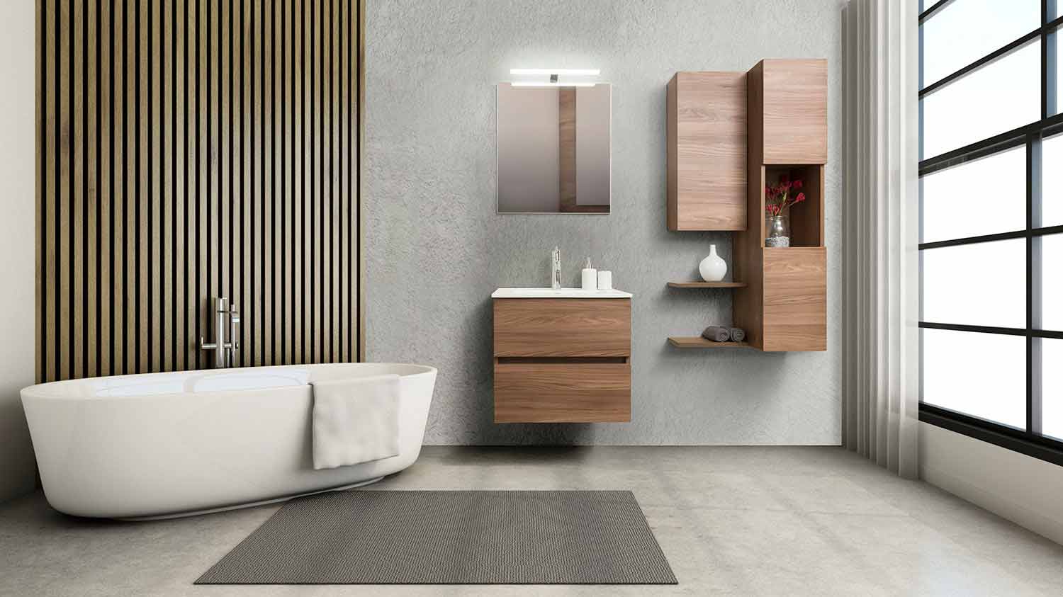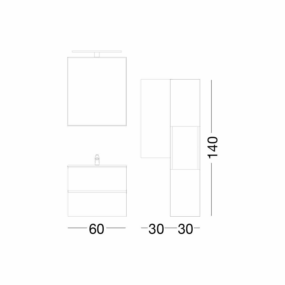 Dulap de baie de 60 cm, bazin de spălare, oglindă, coloană și perete.