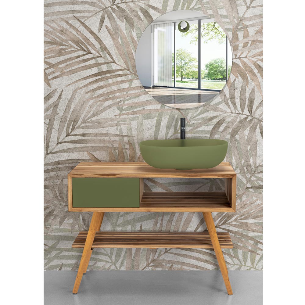 Dulap de baie pe podea cu structura din lemn de tec natural reciclat cu sertar lateral din lemn de mahon verde , o nuanta care aminteste de Est in fiecare detaliu. O estetică deliberat grafică sporită și mai mult de caracterul practic al dimensiunilor sale, ceea ce o face perfectă pentru mobilarea spațiilor mici care au nevoie de un protagonist elegant și funcțional .