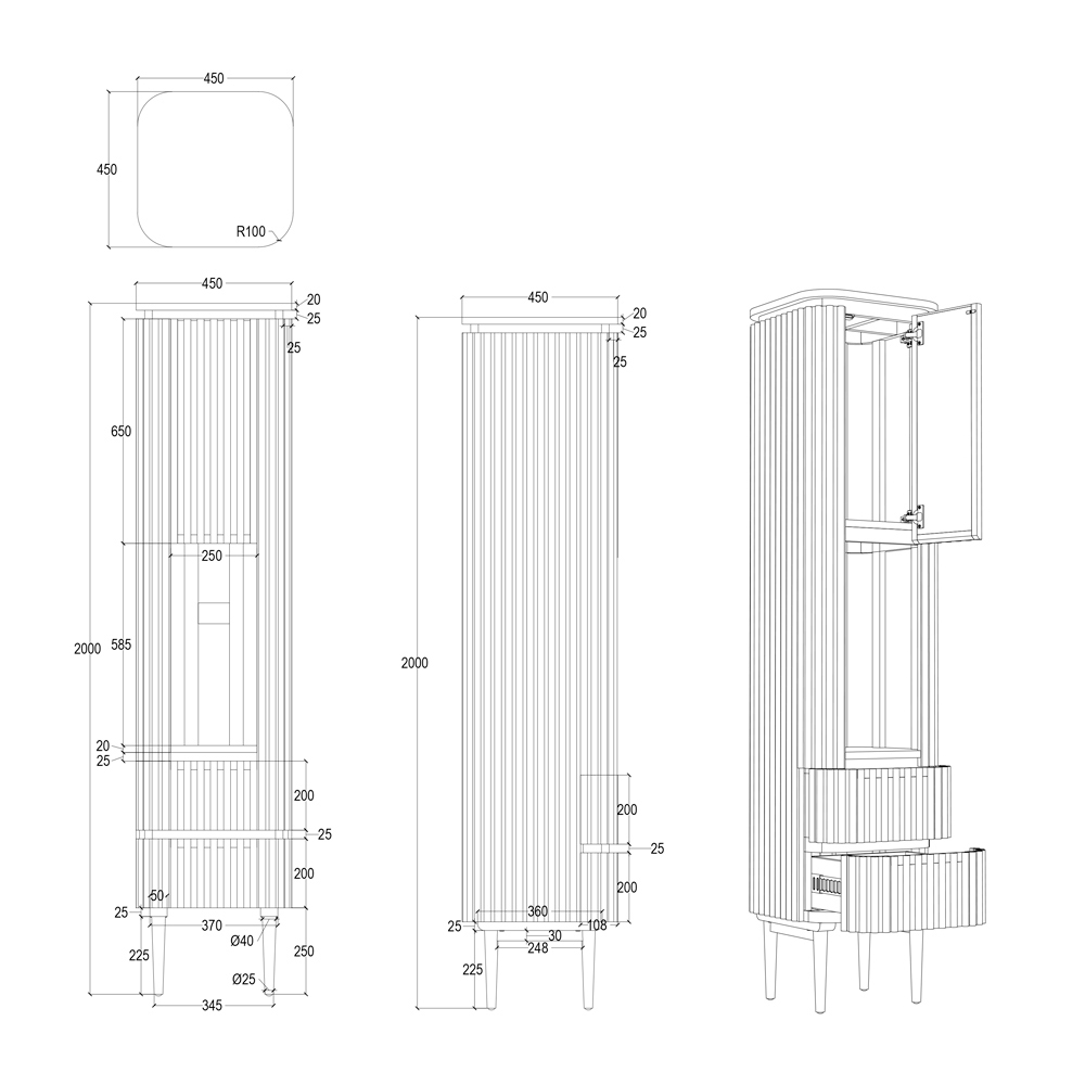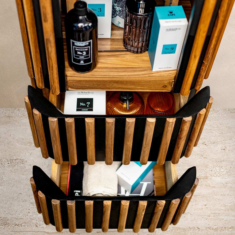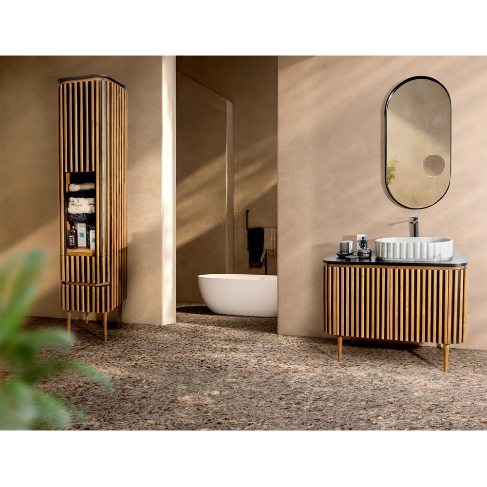 Acest dulap de baie din lemn masiv de tec și mahon este o bijuterie de design, cu formele sale curbate și netede , fără margini sau mânere vizibile. Silueta rotunjită și absența detaliilor de prisos creează o estetică modernă și minimalistă, perfectă pentru un mediu de baie contemporan. Ofera o usa mare, aproape invizibila, cu inchidere lenta, care ascunde un spatiu generos de depozitare in timp ce spatiul central "deschis" se conecteaza la cele doua sertare pretioase de dedesubt. Fuziunea de tec cald cu nuanțele bogate de mahon oferă o notă naturală și elegantă .