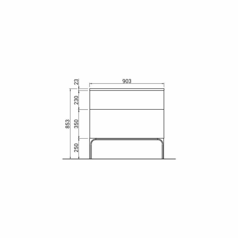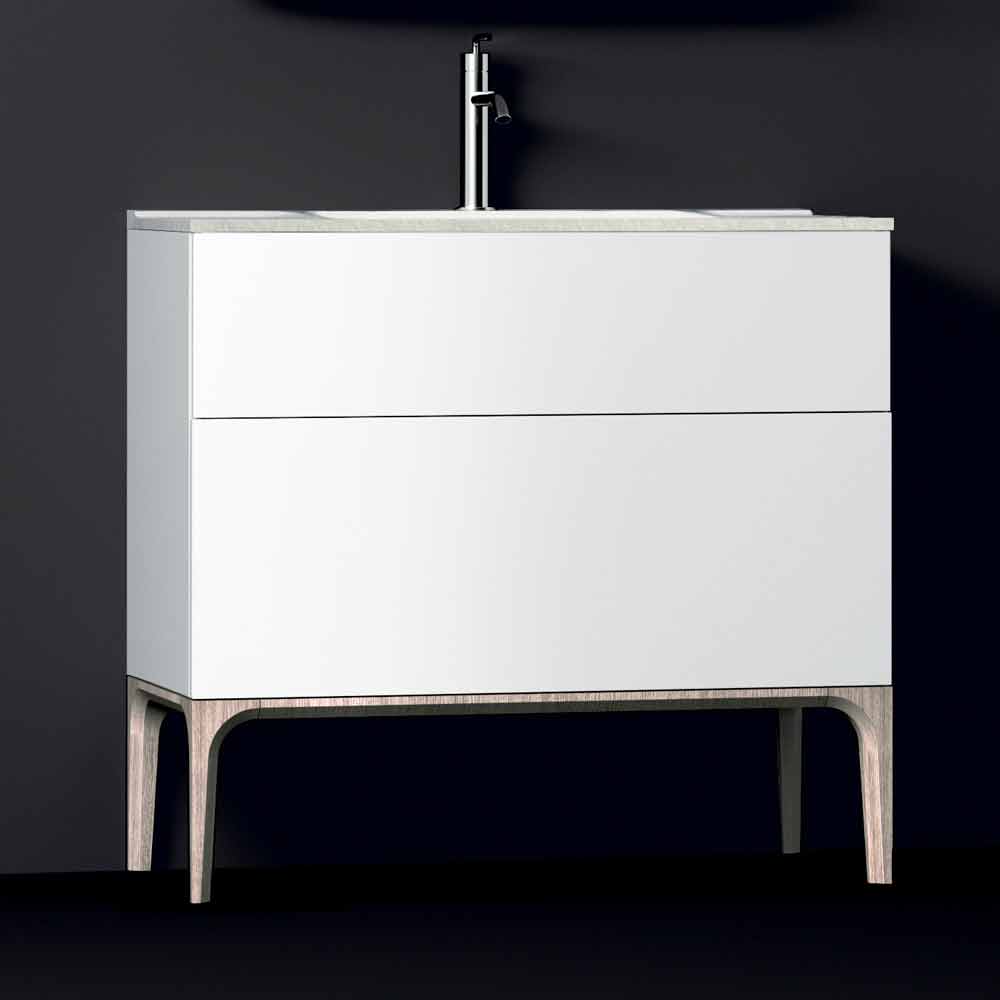 Dulap elegant pentru chiuvete cu 2 sertare cu linie solidă și armonioasă din lemn lăcuit cu picioare din lemn masiv din lemn de stejar natural. Suprafață de rășină integrată disponibilă în diferite finisaje.