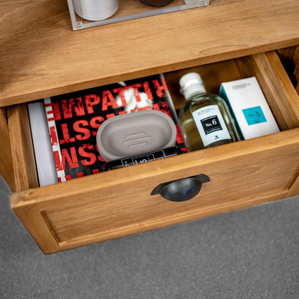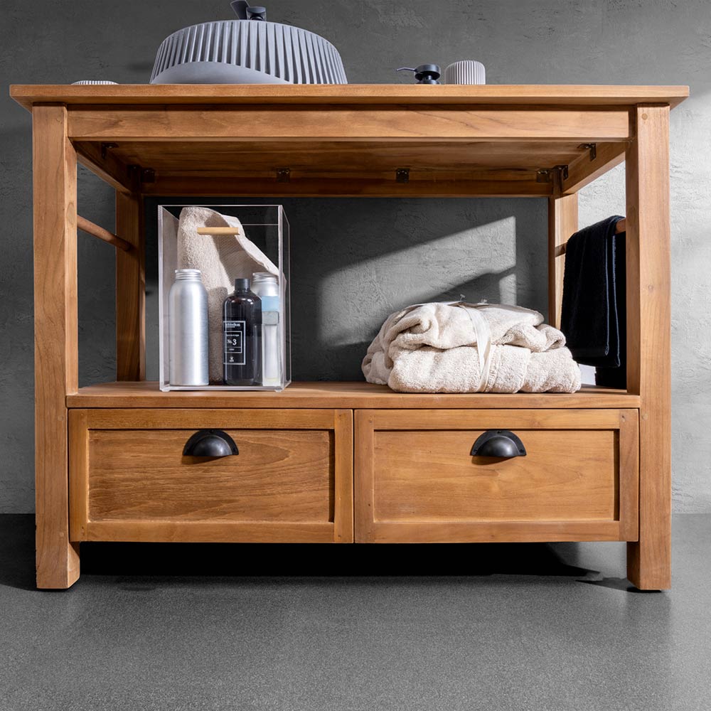 Acest dulap de baie este un exemplu elegant de funcționalitate și stil, ideal pentru a adăuga o notă de clasă oricărui mediu. Fabricat din lemn de tec recuperat solid premium , această piesă de mobilier nu este doar plăcută din punct de vedere estetic, ci este și o opțiune durabilă datorită materialului său 100% natural, ceruit cu grijă pentru a asigura rezistență și durabilitate. Are două sertare spațioase la bază, fiecare împodobită cu mânere de design vintage care adaugă un caracter unic dulapului. Functionalitatea indiscutabila este completata de doua bare de prosoape montate pe lateralele mobilierului.