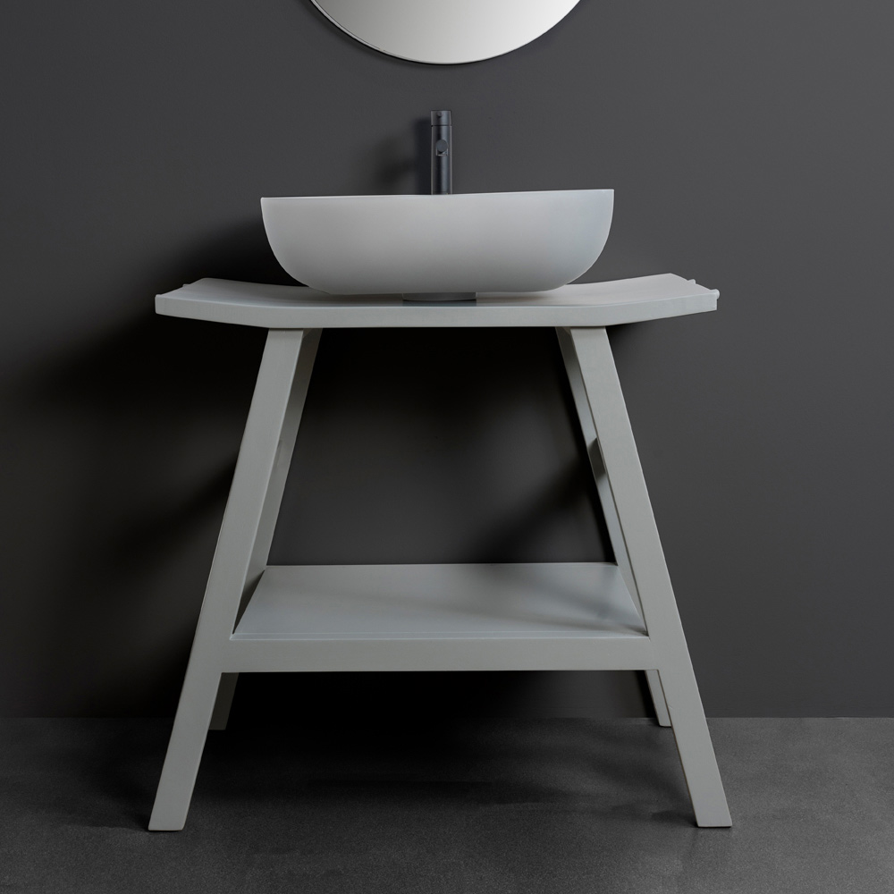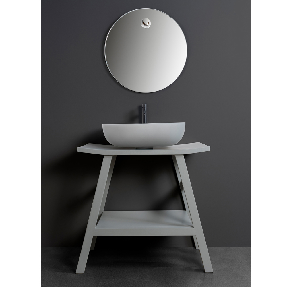 Dulap de baie de sine stătător din lemn de tec natural vopsit gri mat reciclat , o nuanță de culoare atemporală care vorbește limbajul internațional al eleganței, făcându-l perfect în orice mediu și făcându-se discret remarcat. Structura sa se caracterizeaza prin forma usor curbata a blatului care ofera o nota exclusiva si rafinata esteticii produsului. Complet cu 4 cârlige practice pentru prosoape și raft funcțional de depozitare .