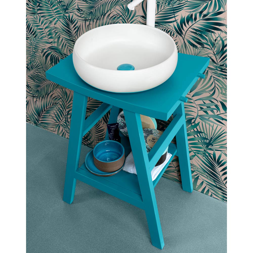 Dulap de baie de sine stătător realizat din lemn de tec natural vopsit în albastru , o culoare care se referă la calm și liniște, creând senzația unei scufundări în albastrul mării Sardiniei, o emoție care se referă la farmecul copleșitor al naturii din interior. Structura sa se caracterizeaza prin forma usor curbata a blatului care ofera o nota exclusiva si rafinata esteticii produsului. Complet cu 4 cârlige practice pentru prosoape și raft funcțional de depozitare .