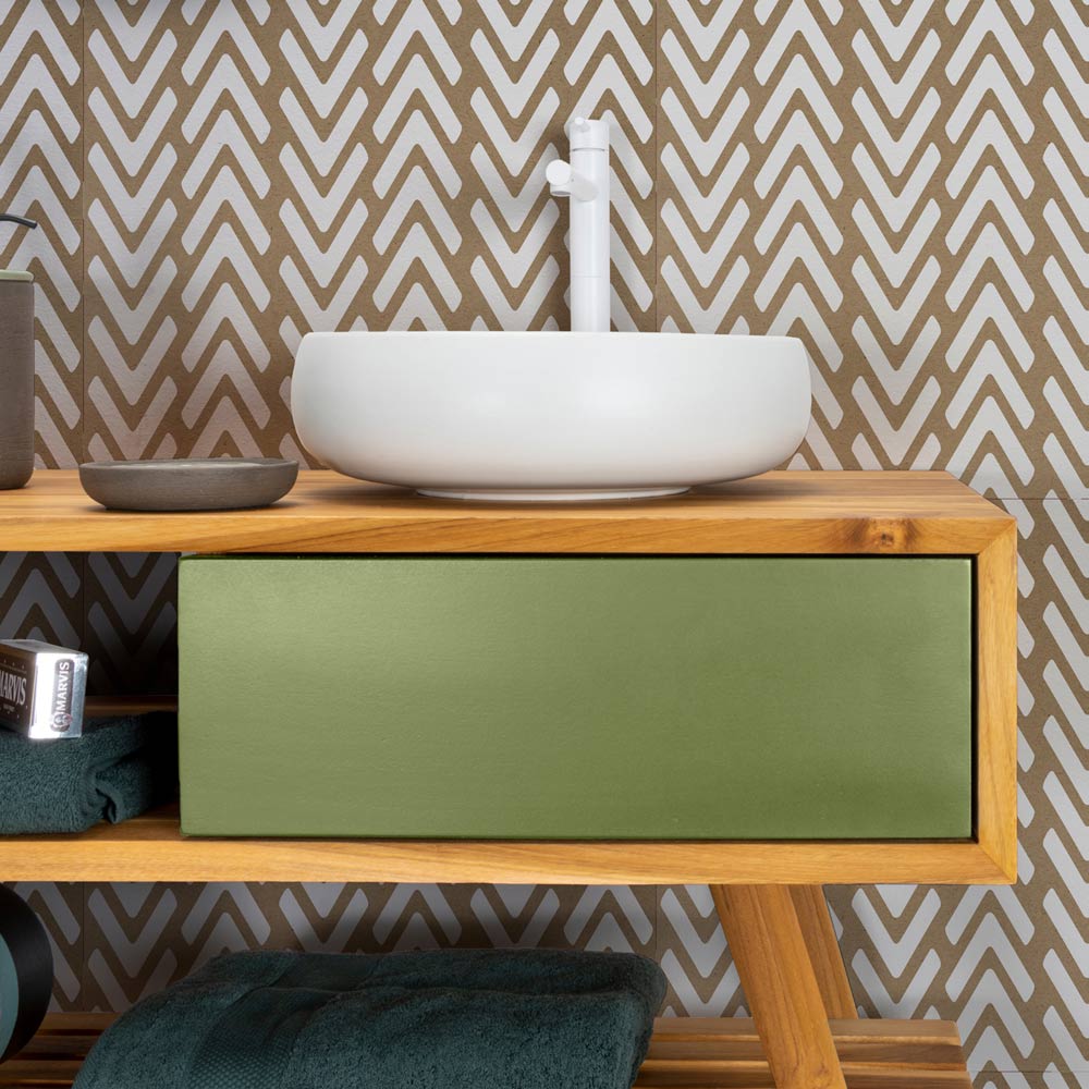 Dulapul de baie de sine stătător cu structură din tec natural reciclat este o combinație exclusivă formată dintr-un blat practic și elegant și 2 sertare din lemn de mahon verde , o nuanță care amintește de Est în fiecare detaliu. O estetică deliberat grafică îmbunătățită și mai mult de combinația sertarului dublu pentru fațadă.
