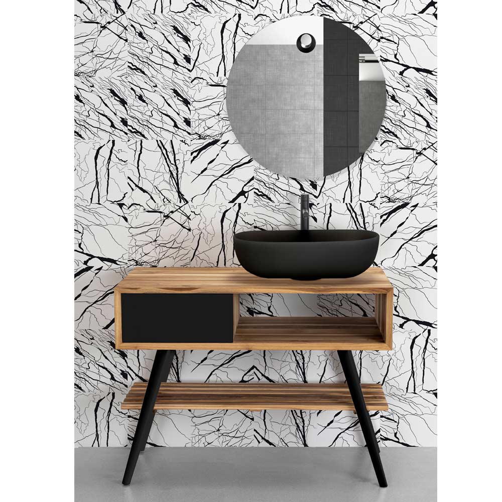 Dulap de baie de sine stătător din tec natural reciclat cu sertar din lemn de mahon vopsit negru mat pentru a se potrivi cu picioarele. O alegere de culoare elegantă și stilată, care iese în evidență în orice situație de amenajare, făcându-l fascinant și misterios și povestitor de atmosfere exclusive și emoții unice. O estetică deliberat grafică sporită și mai mult de caracterul practic al dimensiunilor sale, ceea ce o face perfectă pentru mobilarea spațiilor mici care au nevoie de un protagonist elegant și funcțional .