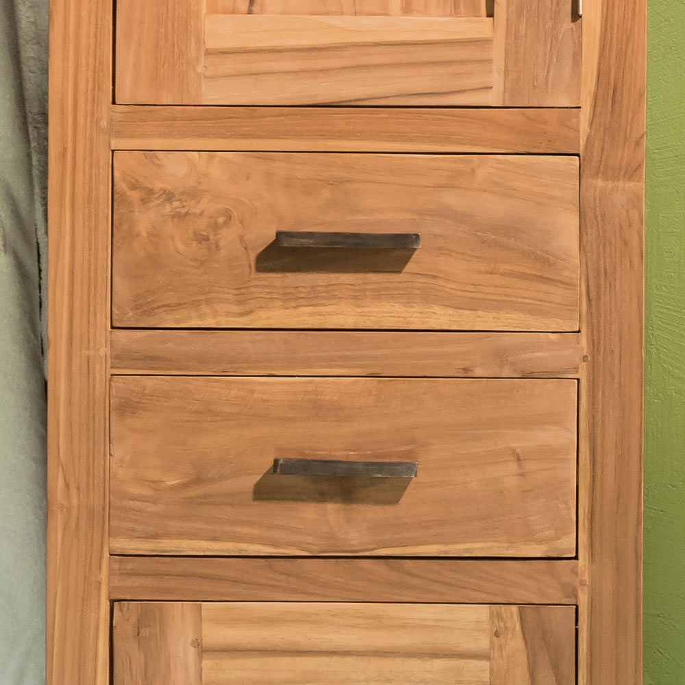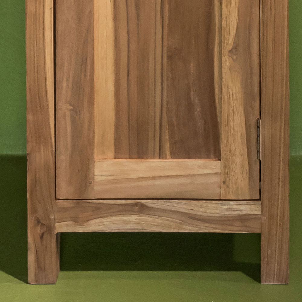 Acest dulap de baie din lemn masiv de tec este o soluție elegantă și funcțională, ideală pentru a vă mobila baia într-un stil natural și rafinat. Structura subțire și măiestria artizanală evidențiază fibra autentică a lemnului , adăugând căldură și caracter chiar și celor mai mici spații.