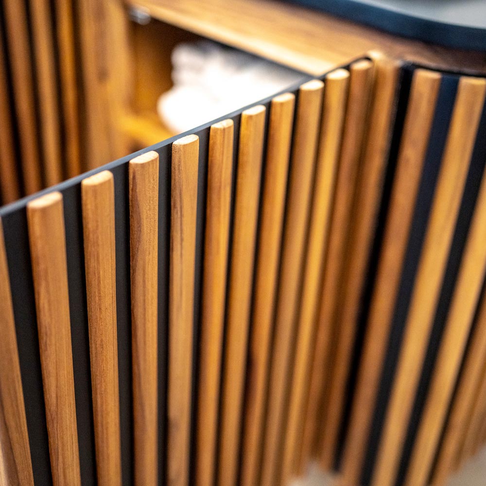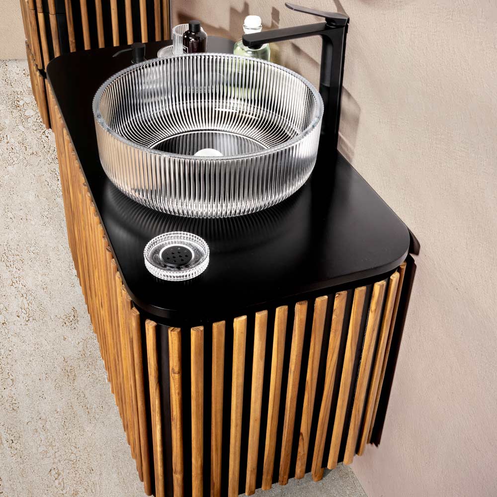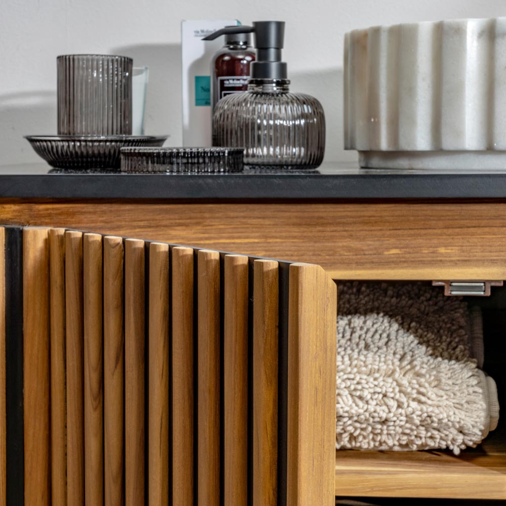Renovați-vă baia cu acest dulap din lemn masiv de tec și mahon , o expresie a luxului și durabilității . Designul liniar și geometric al șipcilor de tec alternează armonios cu căldura mahonului, creând un accesoriu de mobilier pe cât de funcțional, pe atât de plăcut estetic. Este disponibil în două dimensiuni versatile , asigurând o adaptabilitate perfectă atât la spații mari, cât și la cele intime. De asemenea, oferă uși cu închidere ușoară care adaugă o notă de lux și practic. Designul permite instalarea uneia sau mai multor chiuvete , asigurând flexibilitate și personalizare în designul băii dumneavoastră. Cu finisajul său sofisticat și liniile curate, este complementul ideal pentru cei care caută funcționalitate, stil și calitate fără compromisuri.