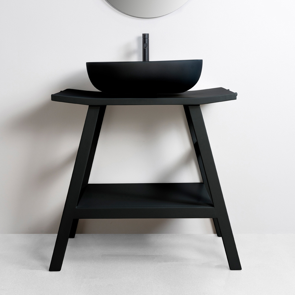 Dulap de baie pe podea din lemn de tec lacuit negru natural recuperat , o alegere elegantă și stilată de culoare care iese în evidență în orice situație de amenajare, făcându-l fascinant și misterios și povestitor de atmosfere exclusive și emoții unice. Structura sa se caracterizeaza prin forma usor curbata a blatului care ofera o nota exclusiva si rafinata esteticii produsului. Complet cu 4 cârlige practice pentru prosoape și raft funcțional de depozitare .