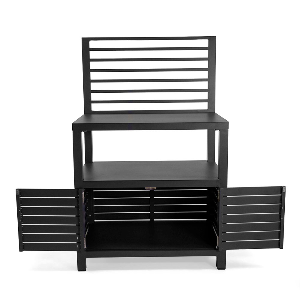Cadrul său robust din aluminiu asigură rezistență la intemperii și durabilitate, în timp ce designul latat adaugă o notă de rafinament. Acest sideboard nu este doar un accesoriu practic, ci și o piesă decorativă care va spori eleganța spațiului dvs. de locuit în aer liber.