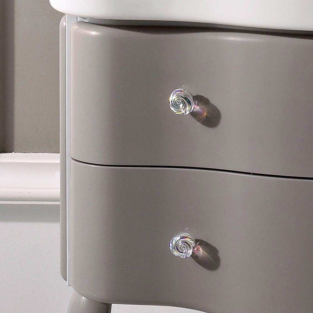Dulap baie din MDF cu doua sertare lacuite lucios , cu chiuveta ceramica alba . Dulapul este bicolor: ușile și picioarele sunt de culoare taupe, în timp ce structura este de culoarea păducelului, sunt incluse butoanele din alamă în formă de trandafir.